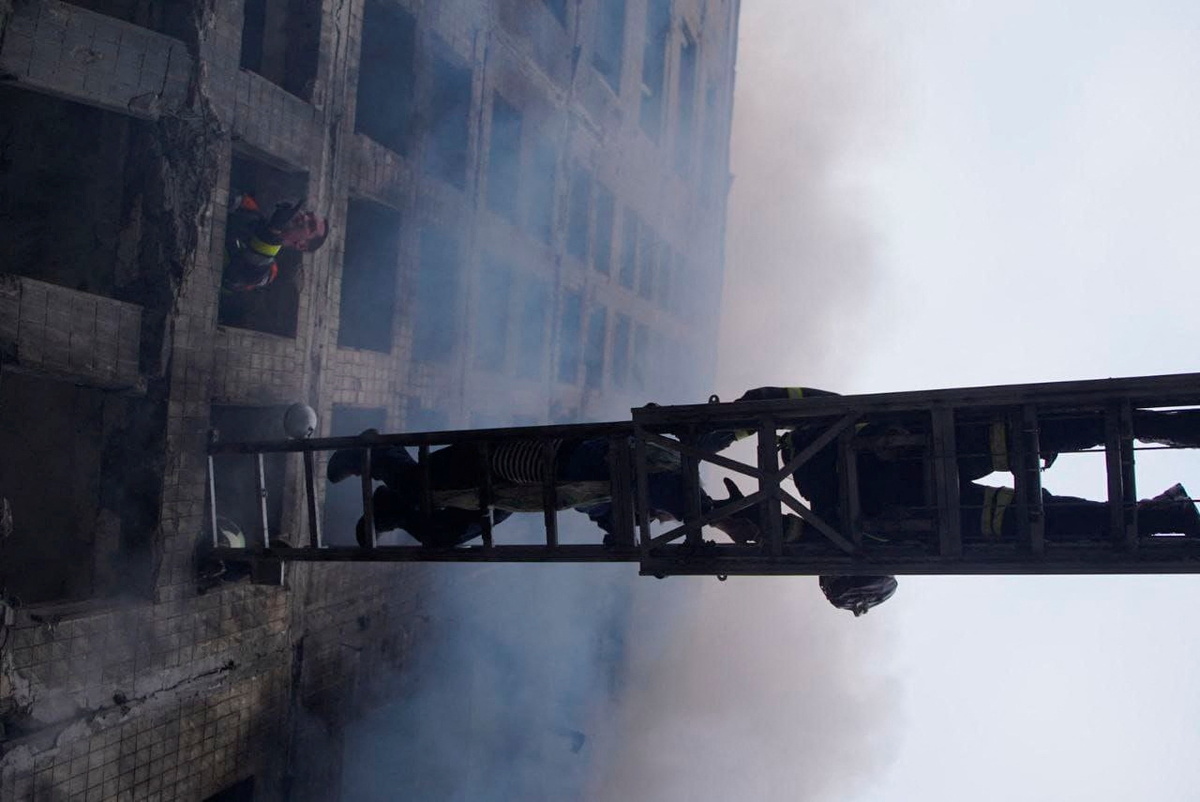 Rescuers work to get people out of a residential building that was struck, as Russia's attack on Ukraine continues, in Kyiv, Ukraine, in this handout picture released March 14, 2022. Press service of the State Emergency Service of Ukraine/Handout via REUTERS