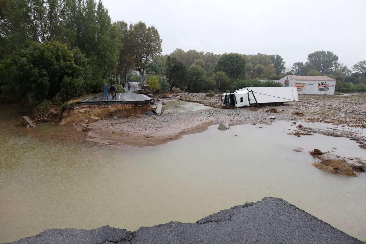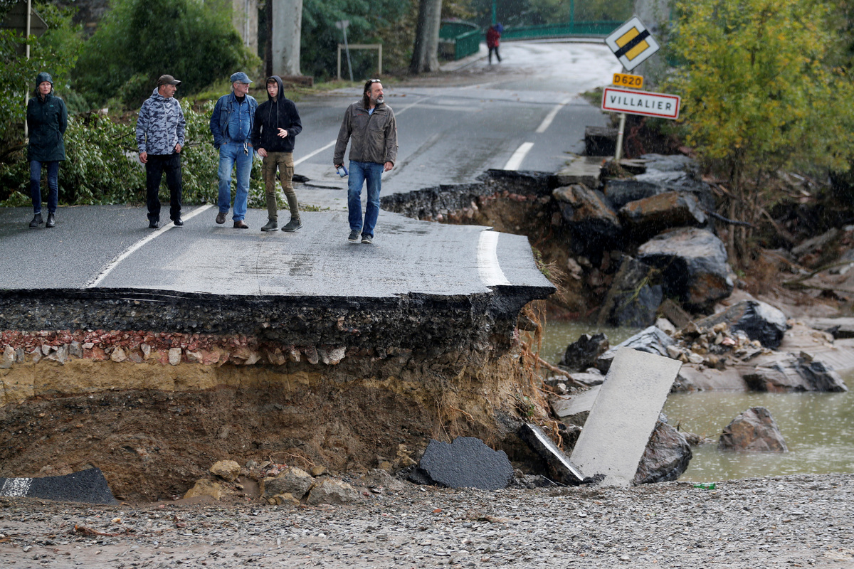People stand on a road that is washed away the day after some of the worst flash floods in a century turned rivers into raging torrents that engulfed homes and swept away cars hit the southwestern Aude district of France, in Villalier, France, October 16, 2018. REUTERS/Jean-Paul Pelissier