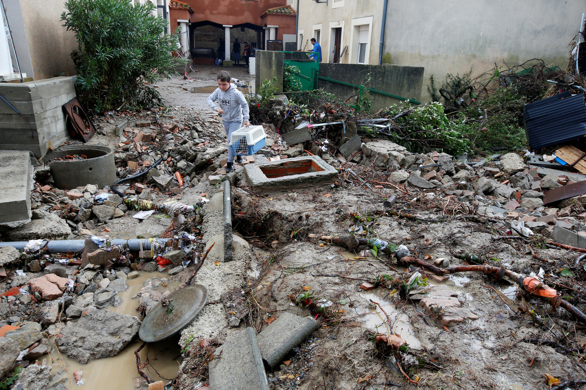 A child carries an animal in its cage on a rubble-strewn street as clean-up operations continue the day after some of the worst flash floods in a century turned rivers into raging torrents that engulfed homes and swept away cars hit the southwestern Aude district of France, in Conques, France, October 16, 2018. REUTERS/Jean-Paul Pelissier