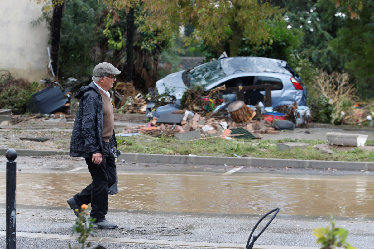 A man walks past a damaged car as clean-up operations continue the day after some of the worst flash floods in a century turned rivers into raging torrents that engulfed homes and swept away cars hit the southwestern Aude district of France, in Conques, France, October 16, 2018. REUTERS/Jean-Paul Pelissier
