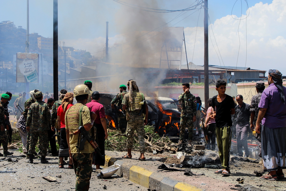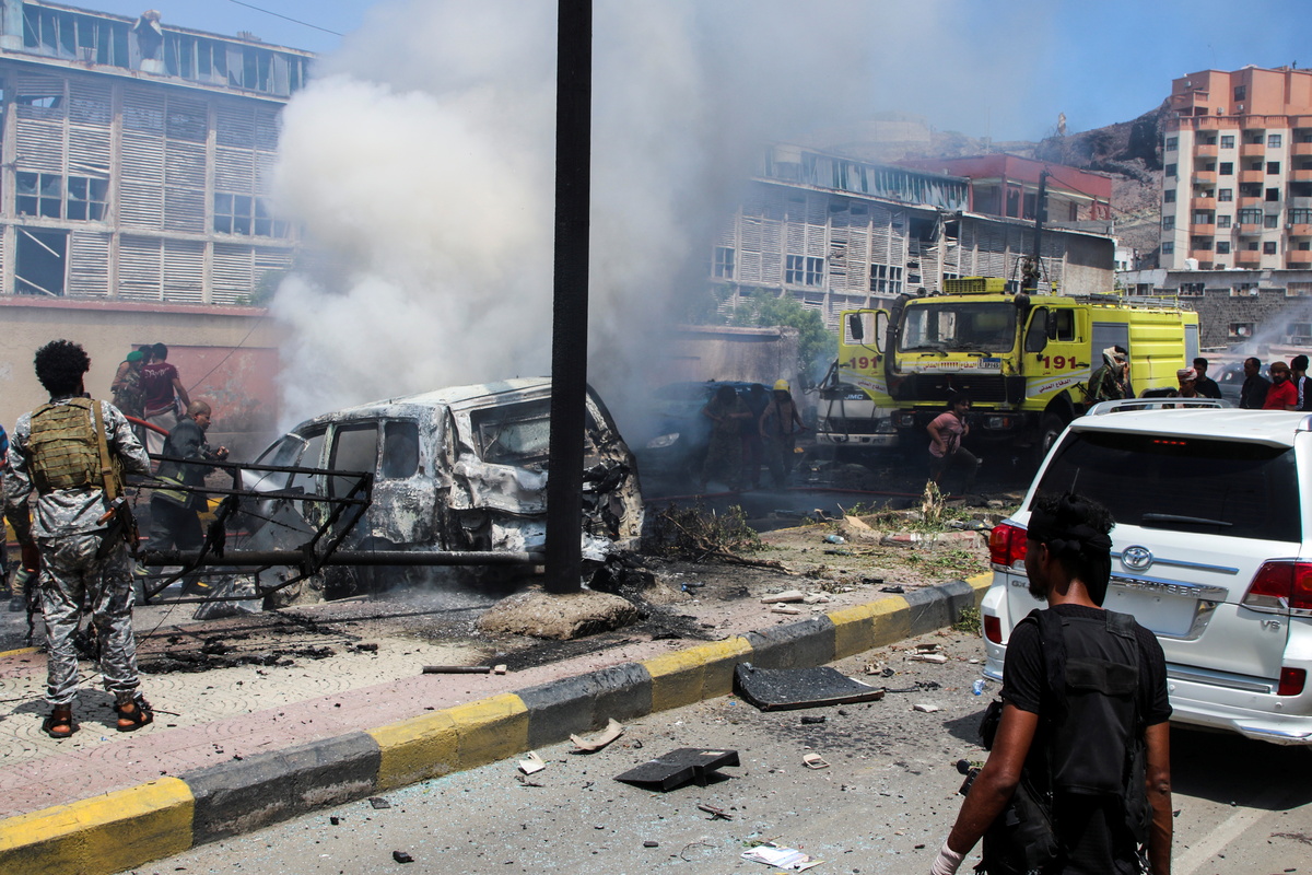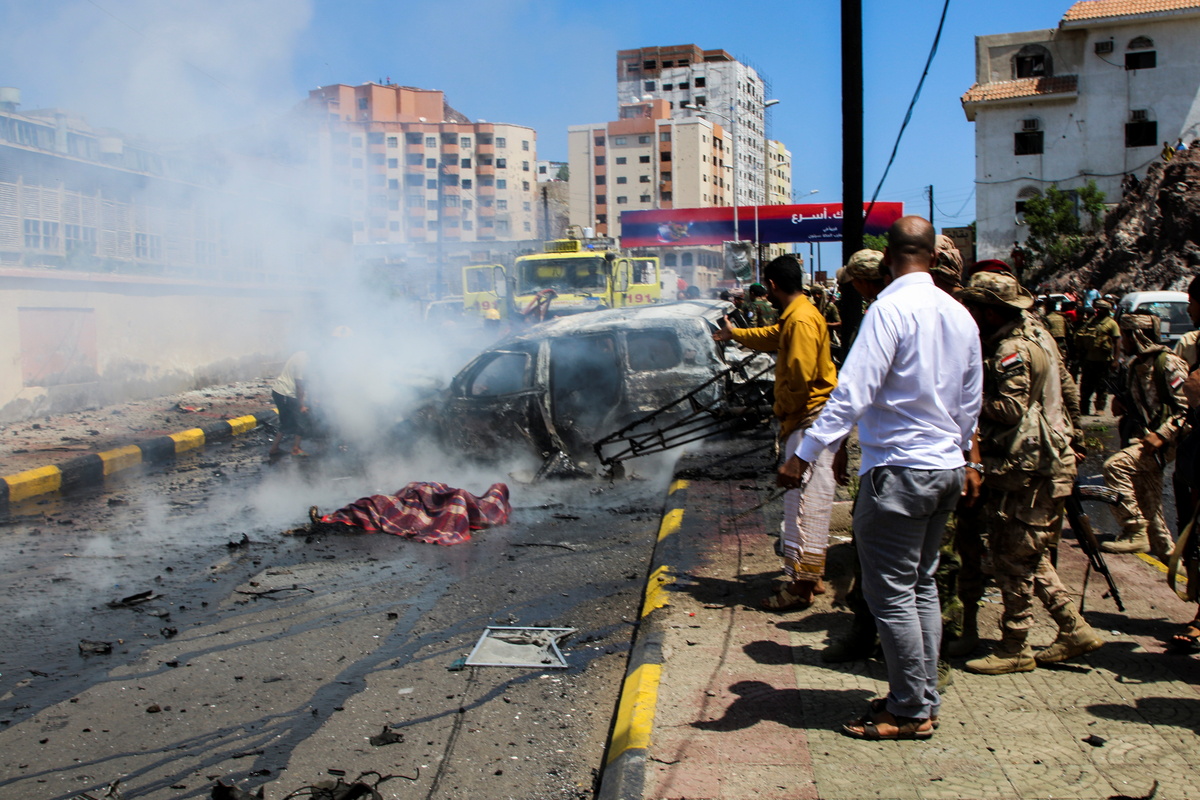 A body covered with a blanket lay on the street next to a charred vehicle in al-Tawahi district, which houses the headquarters of the separatist Southern Transitional Council (STC). Firefighters and police were deployed to the area.