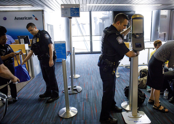 Before getting on a plane, passengers stop at a small station to have their boarding passes scanned and their pictures taken, Customs and Border Protection agents demonstrated on Wednesday. Travelers over the age of 14 and under the age of 79 are required to participate.