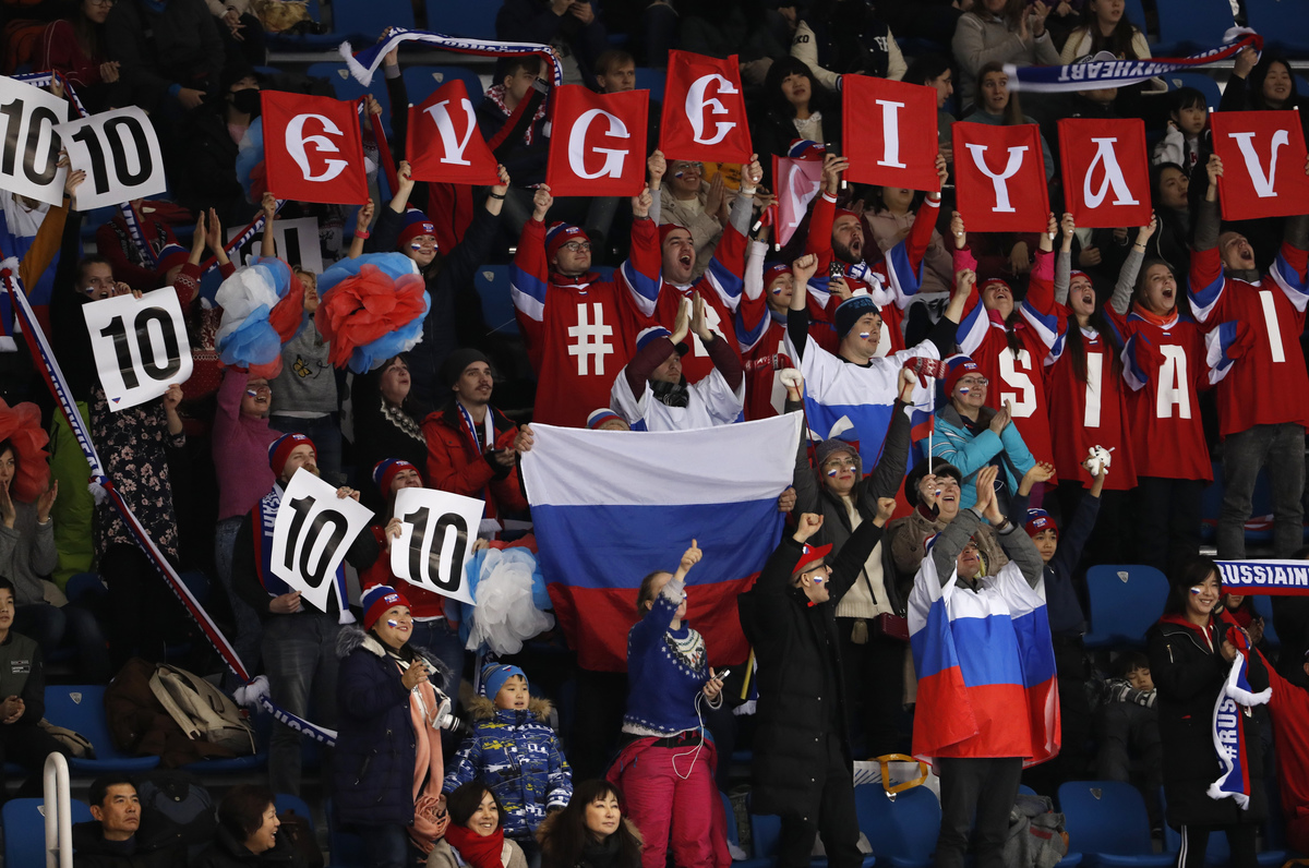 Russian pop songs blare from speakers as women in short dresses twirl through the room. Fans wearing Russian sports jerseys brandish their country's tricolour flags.