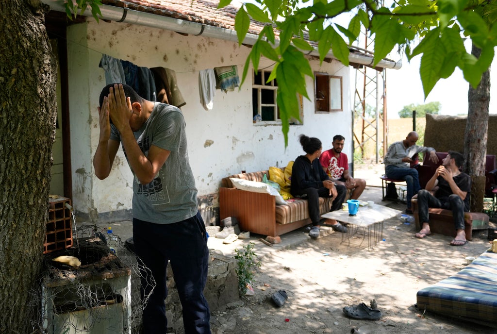 At the other end of the village, in another house, migrants were using an old sofa to sit outside during the day. Inside, makeshift beds and personal belongings could be seen lined by the walls. An old ceiling in one of the rooms has started to crumble.
