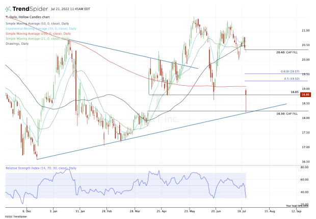 On the upside, let’s see whether the shares can reclaim the 200-day moving average. If it can do that, AT&T stock can begin filling the gap back up to $20.40.