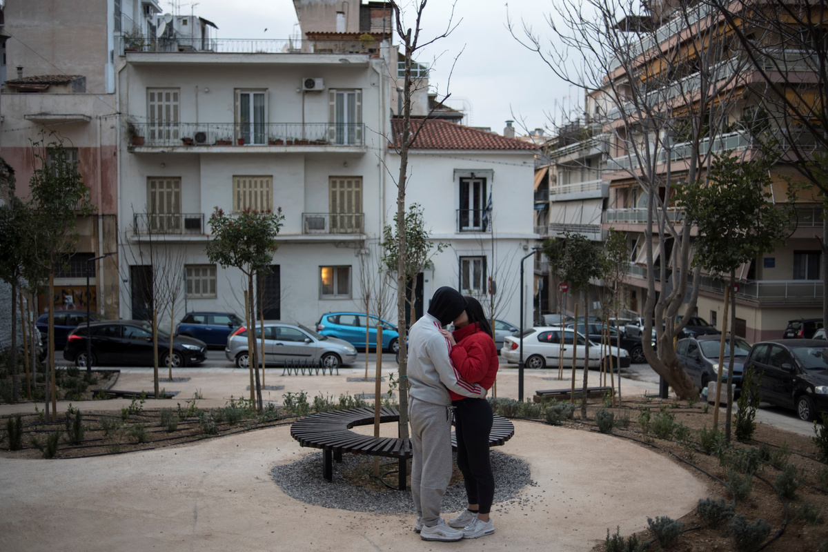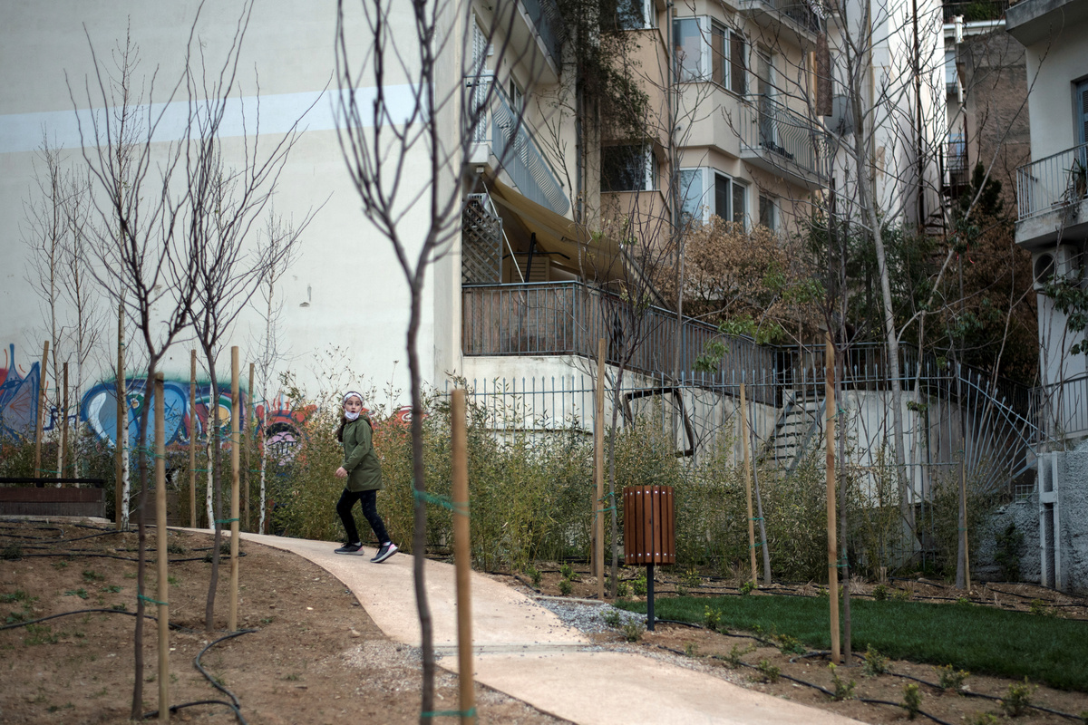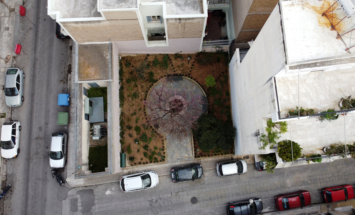 Tucked between rows of apartment blocks on an Athens street, a strip of green with a few trees, some plants and a bench offers a breathing space in the surrounding crush of concrete.