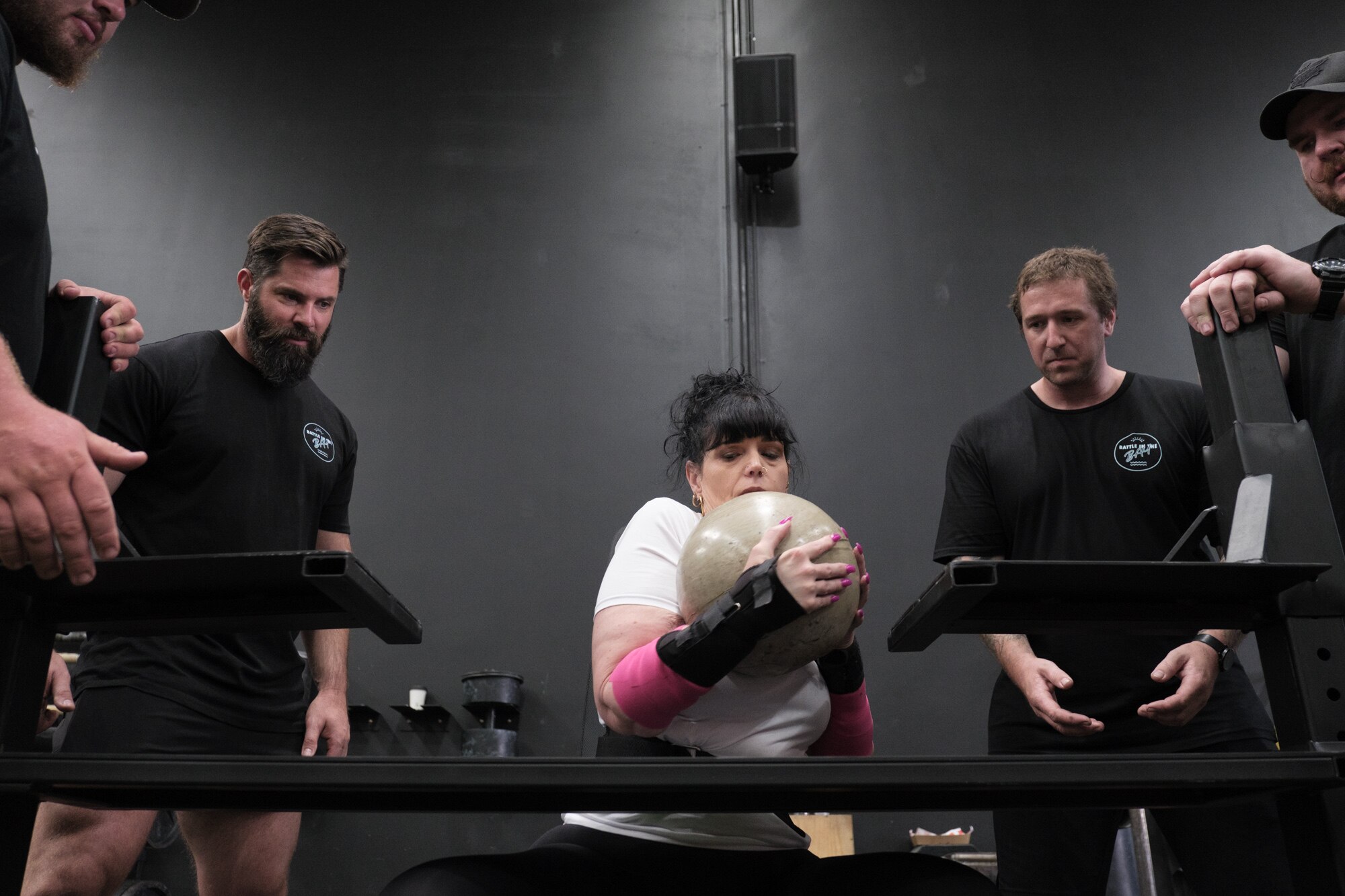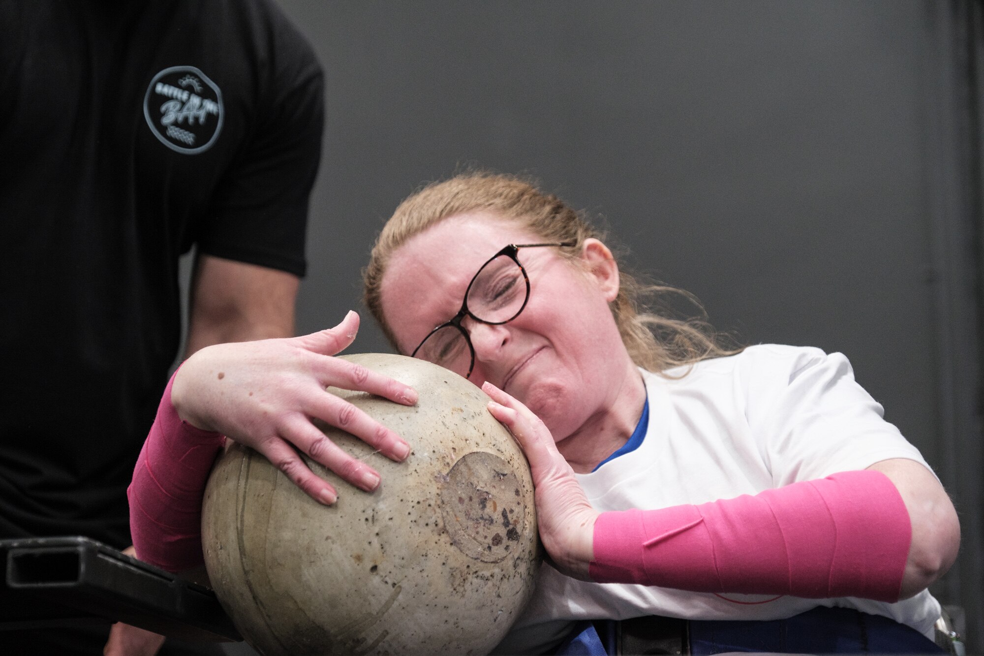 "Athlete ready?" comes the call. Justine nods. She grips the atlas stone tighter and pulls it up and across the bench to the opposite platform.