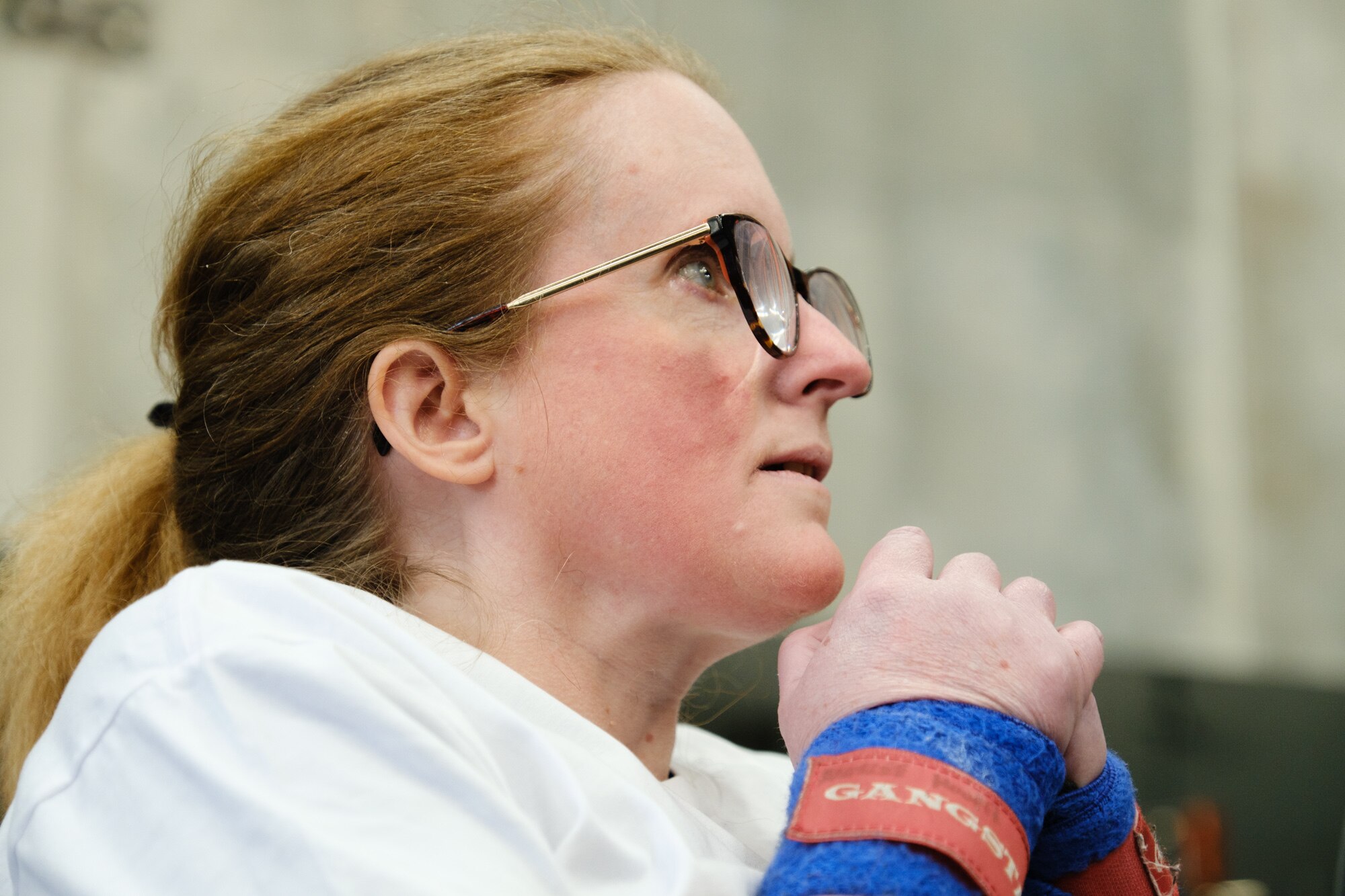 Inside the industrial building that is home to Strong Geelong, Ainslee Hooper, hands chalked and face set in fierce determination, waits for the call.