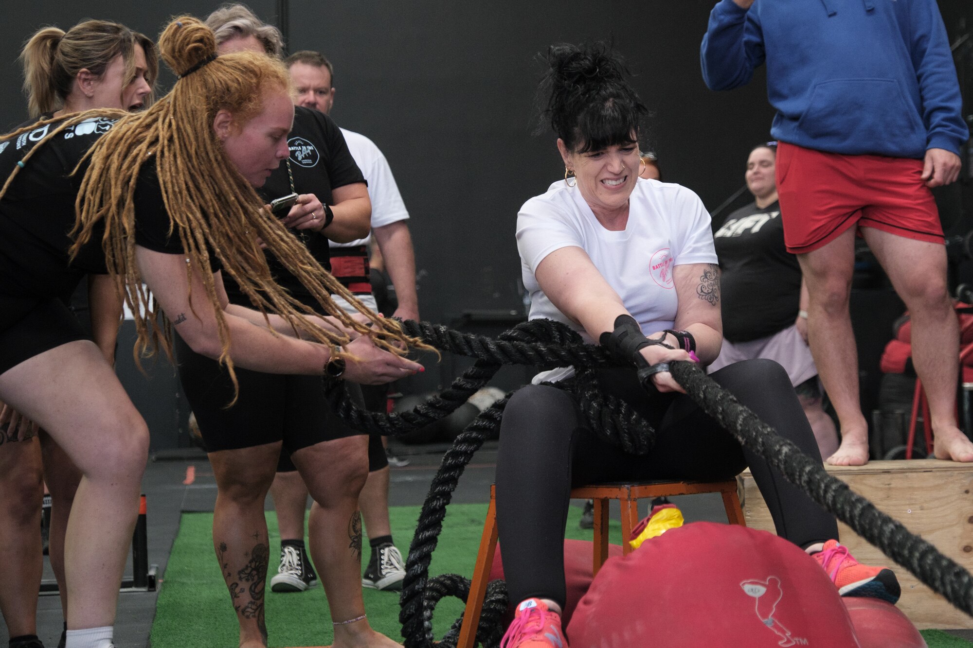 As the sled pull is loaded with weights and the athletes test out their set up, Justine, who works as a public speaker, artist and author, glows with the thrill of competition. The high from the log press is evident in the smile on her face.