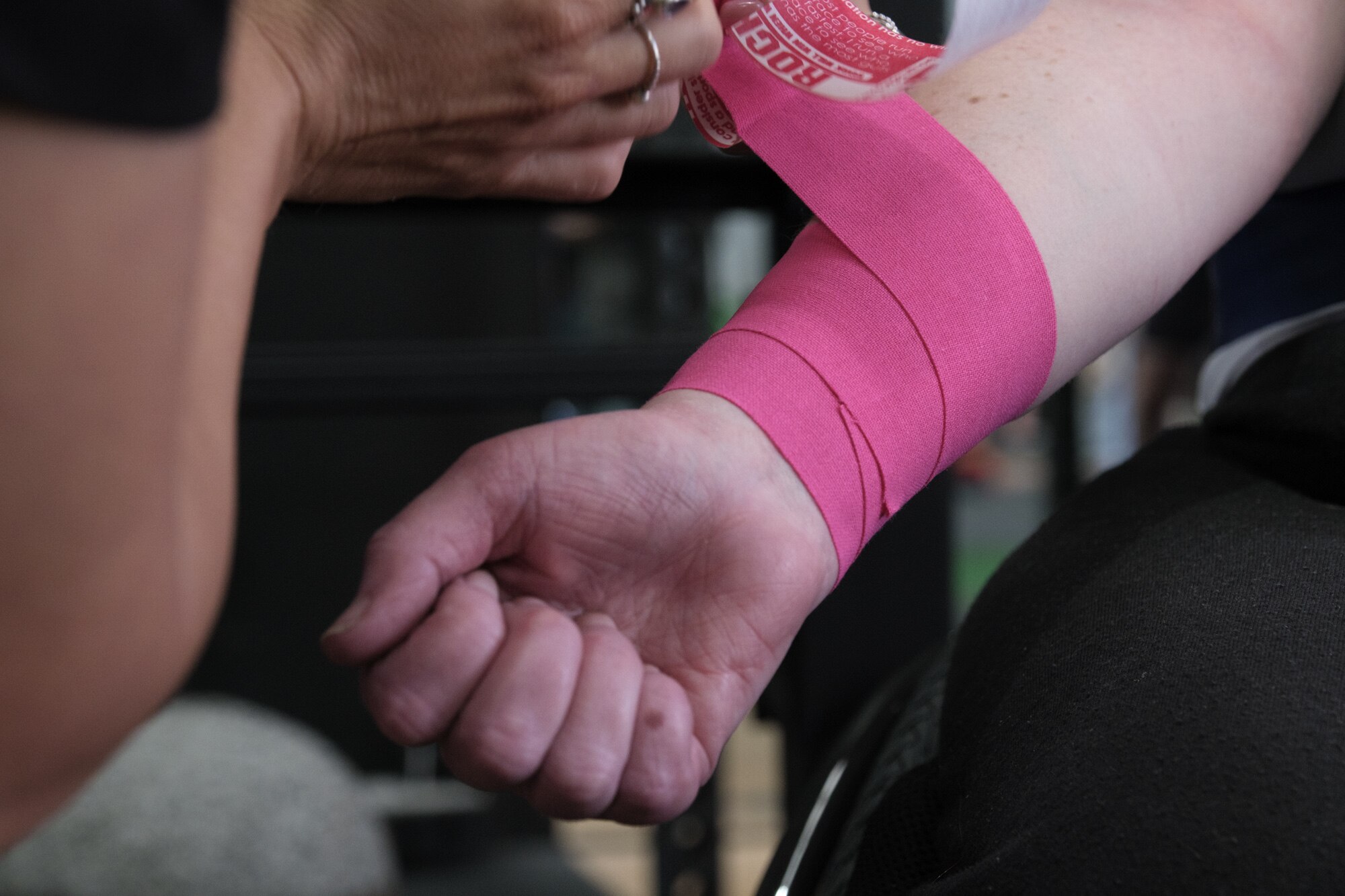 At the bench, Justine grips the stone, her hot pink nails contrasting with the mottled grey concrete. Her hands are covered in Tacky, a product that helps the athletes hold onto the slippery concrete.