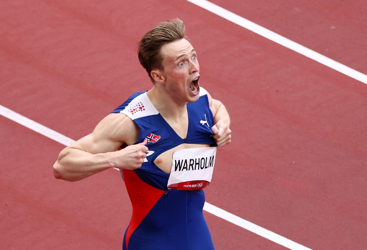 When he saw the astonishing time after going past the finish line in Tokyo, Warholm looked in shock. He ripped his vest apart and beat his chest in celebration before sinking to his knees.