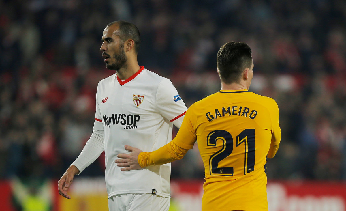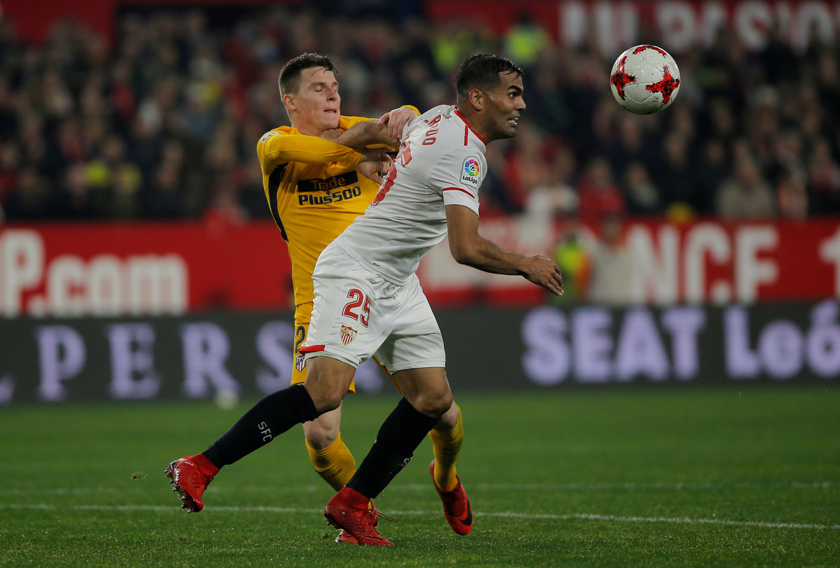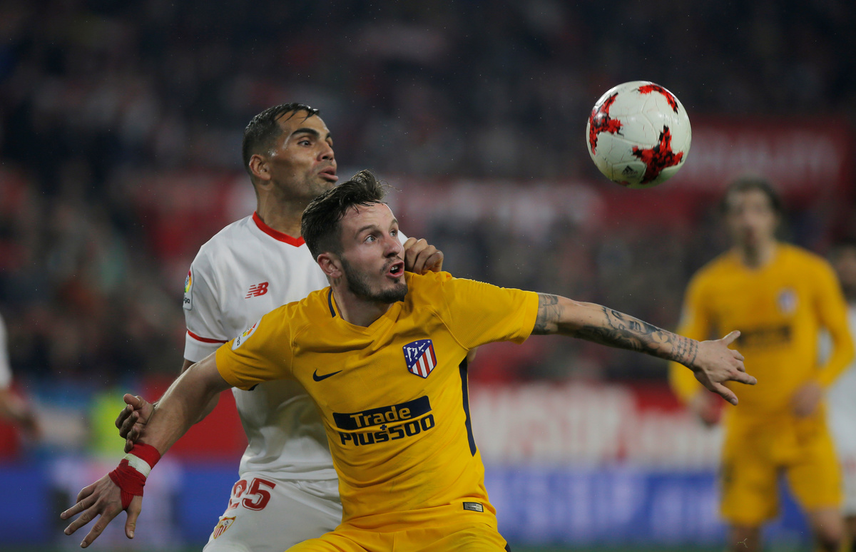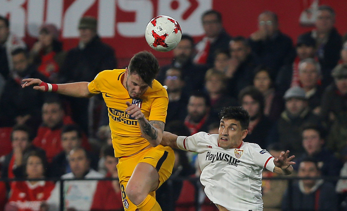 Soccer Football - Spanish King's Cup - Quarter Final Second Leg - Sevilla vs Atletico Madrid - Ramon Sanchez Pizjuan, Seville, Spain - January 23, 2018 Atletico Madrid's Saul Niguez in action with Sevilla’s Gabriel Mercado REUTERS/Jon Nazca