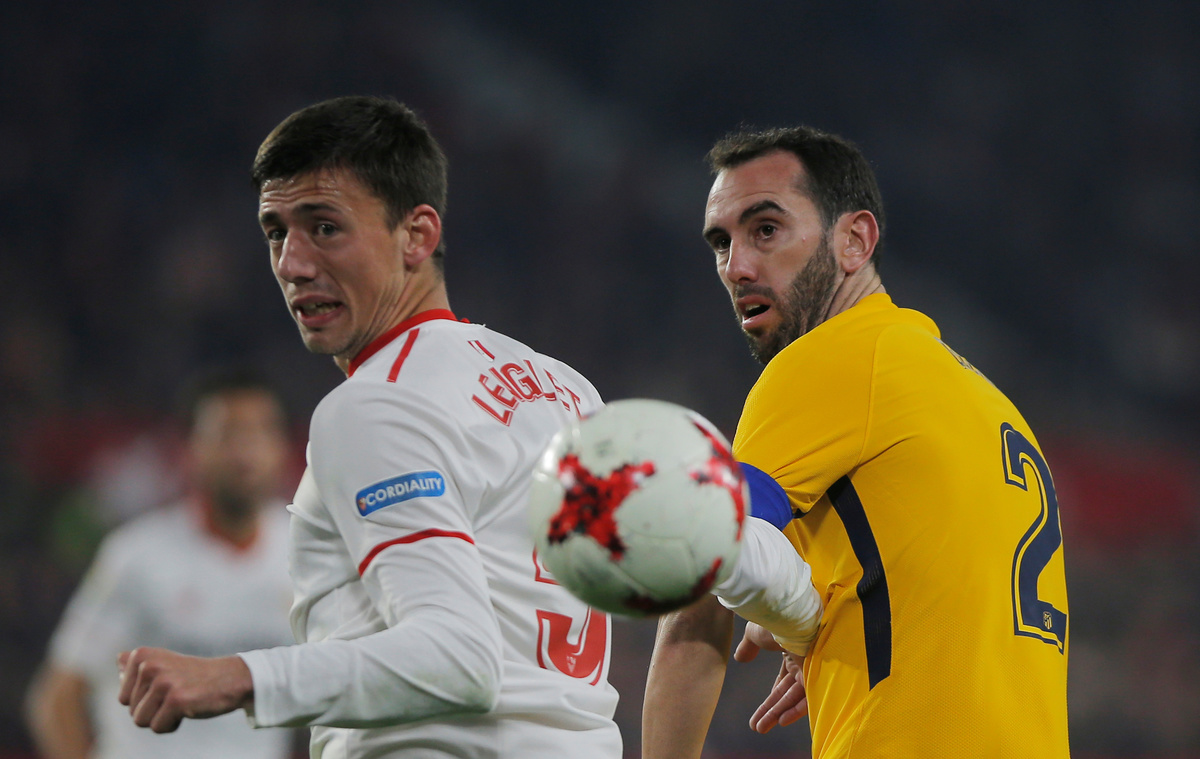 Soccer Football - Spanish King's Cup - Quarter Final Second Leg - Sevilla vs Atletico Madrid - Ramon Sanchez Pizjuan, Seville, Spain - January 23, 2018 Atletico Madrid's Diego Godin in action with Sevilla’s Clement Lenglet REUTERS/Jon Nazca