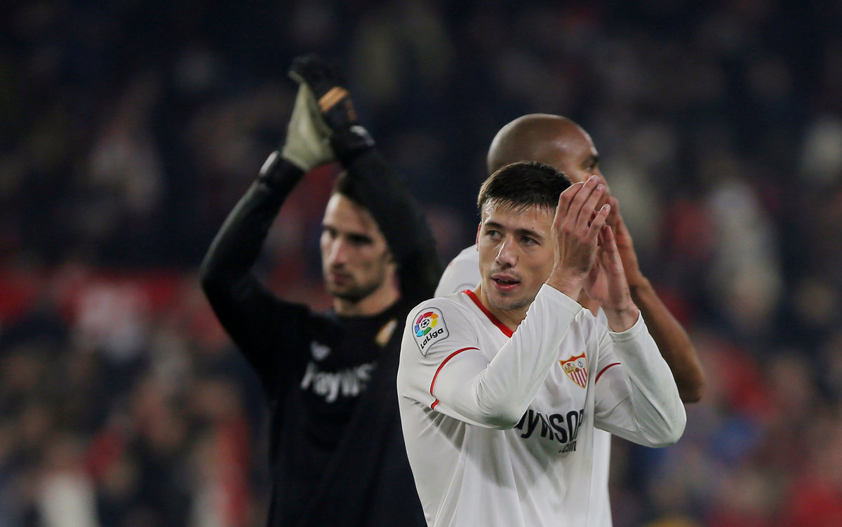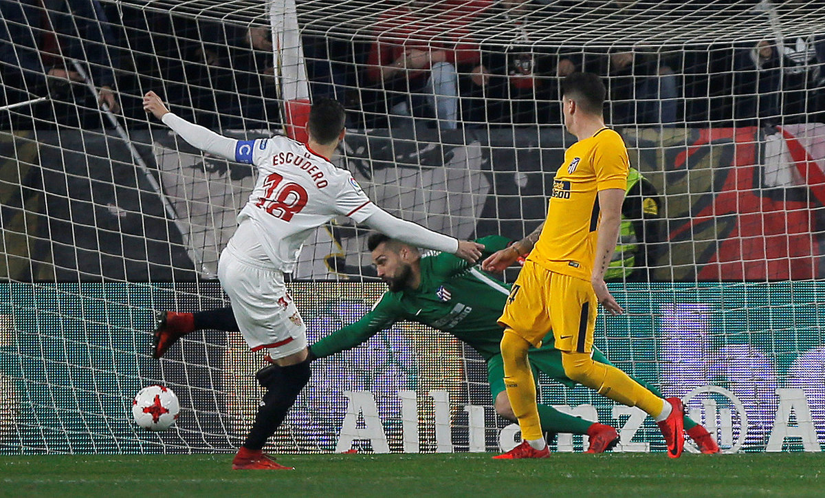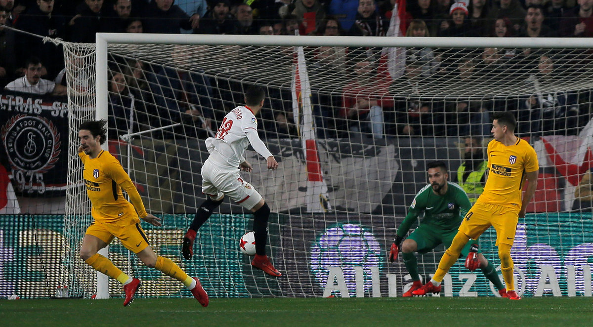 Soccer Football - Spanish King's Cup - Quarter Final Second Leg - Sevilla vs Atletico Madrid - Ramon Sanchez Pizjuan, Seville, Spain - January 23, 2018 Sevilla’s Sergio Escudero scores their first goal REUTERS/Jon Nazca