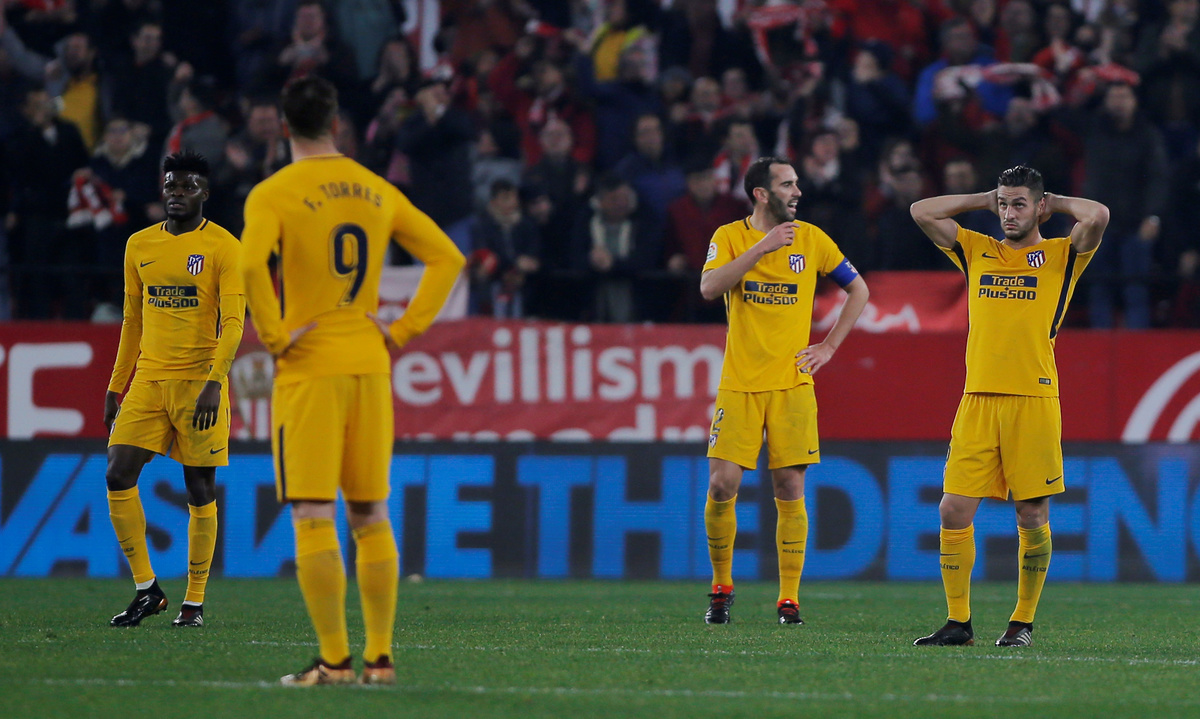 Soccer Football - Spanish King's Cup - Quarter Final Second Leg - Sevilla vs Atletico Madrid - Ramon Sanchez Pizjuan, Seville, Spain - January 23, 2018 Atletico Madrid's Diego Godin and team mates react after conceding their third goal REUTERS/Jon NazcaSoccer Football - Spanish King's Cup - Quarter Final Second Leg - Sevilla vs Atletico Madrid - Ramon Sanchez Pizjuan, Seville, Spain - January 23, 2018 Sevilla’s Sergio Escudero scores their first goal REUTERS/Jon NazcaSoccer Football - Spanish King's Cup - Quarter Final Second Leg - Sevilla vs Atletico Madrid - Ramon Sanchez Pizjuan, Seville, Spain - January 23, 2018 Sevilla’s Sergio Escudero scores their first goal REUTERS/Jon NazcaSoccer Football - Spanish King's Cup - Quarter Final Second Leg - Sevilla vs Atletico Madrid - Ramon Sanchez Pizjuan, Seville, Spain - January 23, 2018 Sevilla’s Sergio Rico celebrates a goal REUTERS/Jon NazcaSoccer Football - Spanish King's Cup - Quarter Final Second Leg - Sevilla vs Atletico Madrid - Ramon Sanchez Pizjuan, Seville, Spain - January 23, 2018 Sevilla’s Clement Lenglet applauds fans after the match REUTERS/Jon NazcaSoccer Football - Spanish King's Cup - Quarter Final Second Leg - Sevilla vs Atletico Madrid - Ramon Sanchez Pizjuan, Seville, Spain - January 23, 2018 Atletico Madrid's Fernando Torres reacts REUTERS/Jon NazcaSoccer Football - Spanish King's Cup - Quarter Final Second Leg - Sevilla vs Atletico Madrid - Ramon Sanchez Pizjuan, Seville, Spain - January 23, 2018 Atletico Madrid's Diego Godin reacts after missing a chance to score REUTERS/Jon NazcaSoccer Football - Spanish King's Cup - Quarter Final Second Leg - Sevilla vs Atletico Madrid - Ramon Sanchez Pizjuan, Seville, Spain - January 23, 2018 Sevilla’s Guido Pizarro and Atletico Madrid's Kevin Gameiro after the match REUTERS/Jon NazcaSoccer Football - Spanish King's Cup - Quarter Final Second Leg - Sevilla vs Atletico Madrid - Ramon Sanchez Pizjuan, Seville, Spain - January 23, 2018 Atletico Madrid's Kevin Gameiro looks dejected after the match REUTERS/Jon NazcaSoccer Football - Spanish King's Cup - Quarter Final Second Leg - Sevilla vs Atletico Madrid - Ramon Sanchez Pizjuan, Seville, Spain - January 23, 2018 Atletico Madrid's Kevin Gameiro in action with Sevilla’s Gabriel Mercado REUTERS/Jon NazcaSoccer Football - Spanish King's Cup - Quarter Final Second Leg - Sevilla vs Atletico Madrid - Ramon Sanchez Pizjuan, Seville, Spain - January 23, 2018 Sevilla coach Vincenzo Montella REUTERS/Jon NazcaSoccer Football - Spanish King's Cup - Quarter Final Second Leg - Sevilla vs Atletico Madrid - Ramon Sanchez Pizjuan, Seville, Spain - January 23, 2018 Atletico Madrid's Angel Correa in action with Sevilla’s Gabriel Mercado and Sergio Escudero (L) REUTERS/Jon NazcaSoccer Football - Spanish King's Cup - Quarter Final Second Leg - Sevilla vs Atletico Madrid - Ramon Sanchez Pizjuan, Seville, Spain - January 23, 2018 Atletico Madrid's Saul Niguez in action with Sevilla’s Jesus Navas REUTERS/Jon Nazca