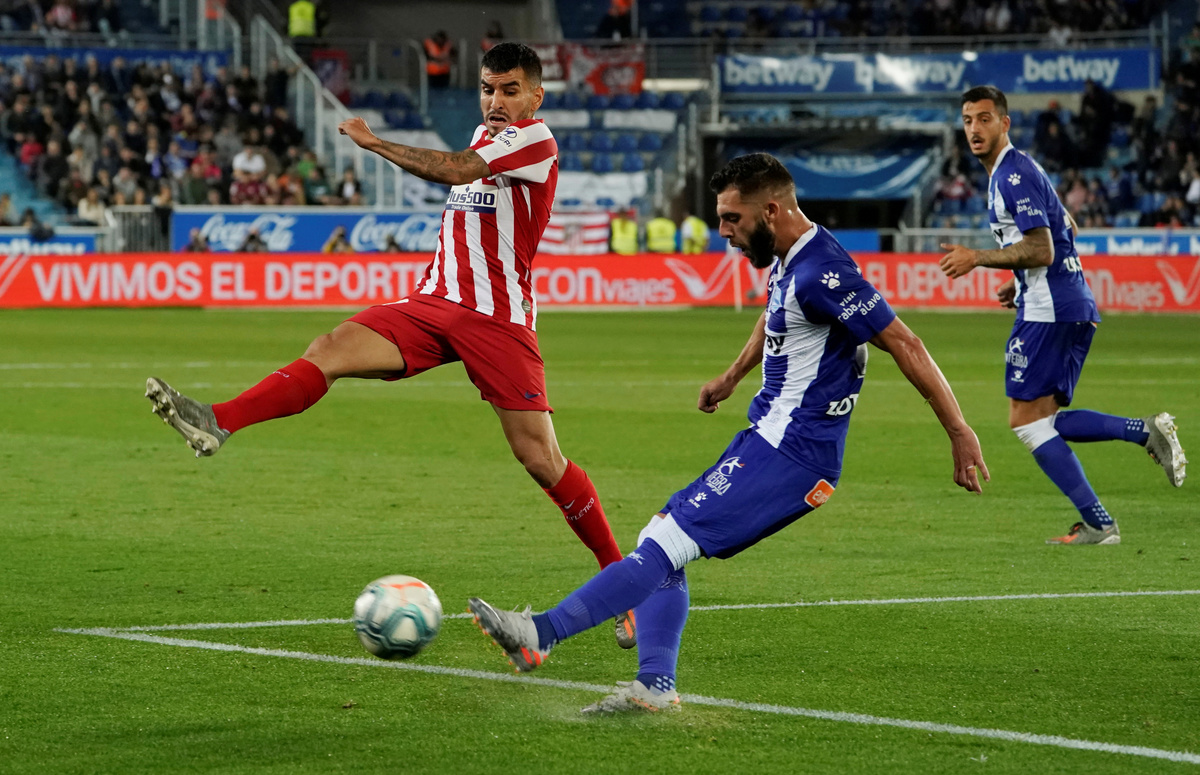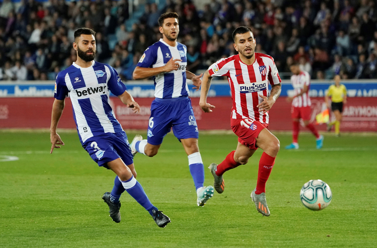 Soccer Football - La Liga Santander - Deportivo Alaves v Atletico Madrid - Estadio Mendizorroza, Vitoria-Gasteiz, Spain - October 29, 2019 Deportivo Alaves' Ruben Duarte in action with Atletico Madrid's Angel Correa REUTERS/Vincent West