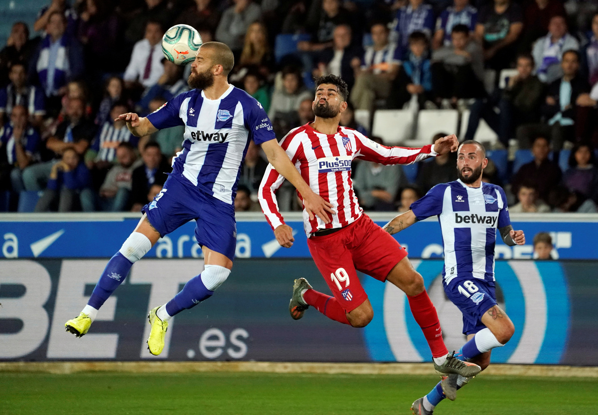 Soccer Football - La Liga Santander - Deportivo Alaves v Atletico Madrid - Estadio Mendizorroza, Vitoria-Gasteiz, Spain - October 29, 2019 Deportivo Alaves' Victor Laguardia and Aleix Vidal in action with Atletico Madrid's Diego Costa REUTERS/Vincent West