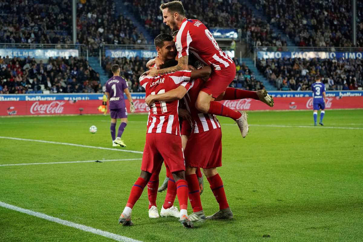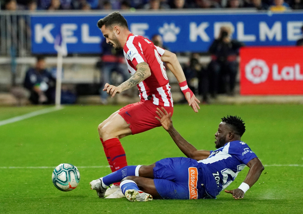 Soccer Football - La Liga Santander - Deportivo Alaves v Atletico Madrid - Estadio Mendizorroza, Vitoria-Gasteiz, Spain - October 29, 2019 Atletico Madrid's Alvaro Morata celebrates scoring their first goal with Saul Niguez and teammates REUTERS/Vincent WestSoccer Football - La Liga Santander - Deportivo Alaves v Atletico Madrid - Estadio Mendizorroza, Vitoria-Gasteiz, Spain - October 29, 2019 Atletico Madrid's Saul Niguez in action with Deportivo Alaves' Mubarak Wakaso REUTERS/Vincent WestSoccer Football - La Liga Santander - Deportivo Alaves v Atletico Madrid - Estadio Mendizorroza, Vitoria-Gasteiz, Spain - October 29, 2019 Atletico Madrid coach Diego Simeone and Deportivo Alaves' Martin Aguirregabiria REUTERS/Vincent West