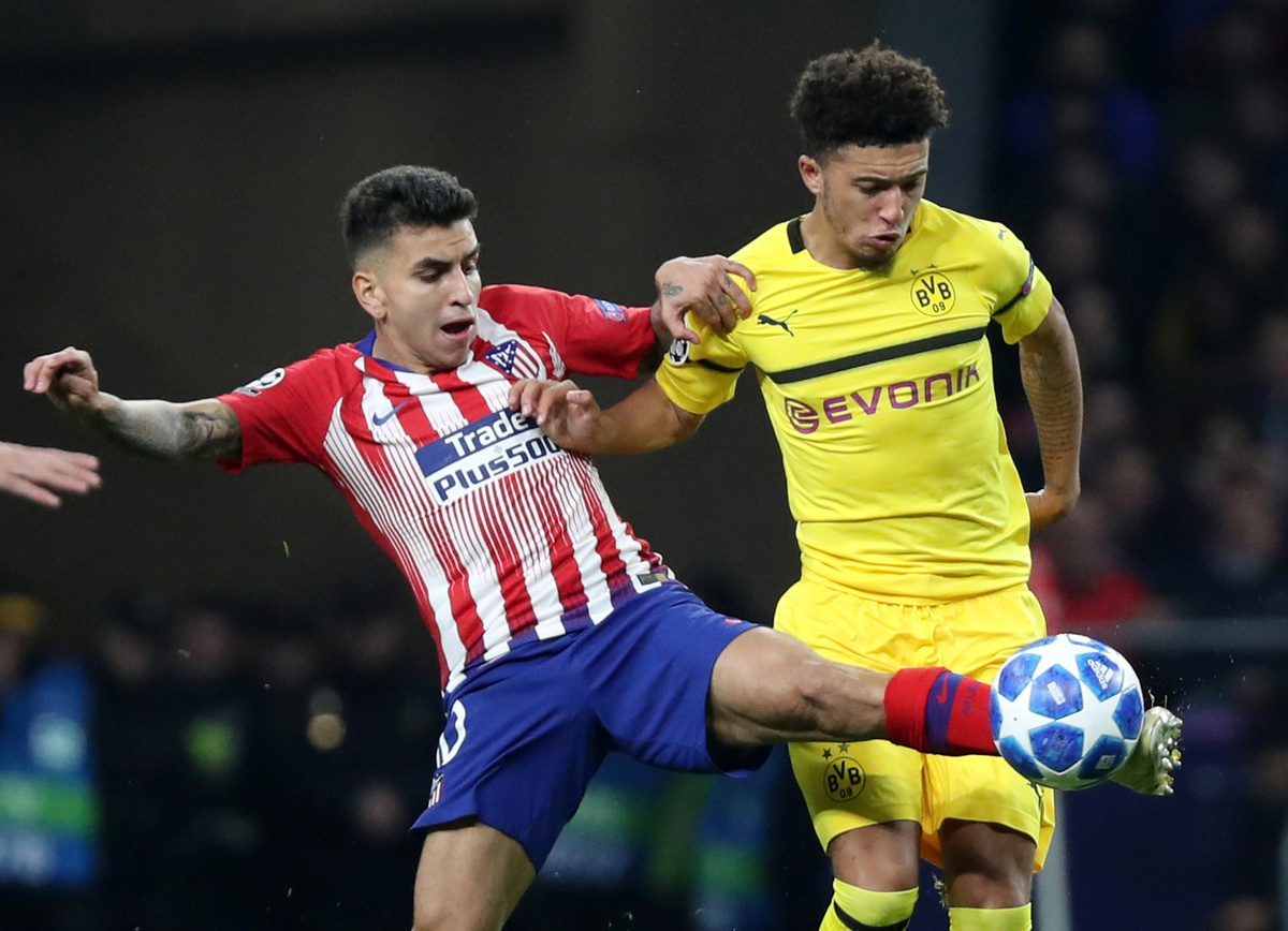 Soccer Football - Champions League - Group Stage - Group A - Atletico Madrid v Borussia Dortmund - Wanda Metropolitano, Madrid, Spain - November 6, 2018 Atletico Madrid's Angel Correa in action with Borussia Dortmund's Jadon Sancho REUTERS/Susana Vera