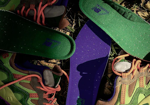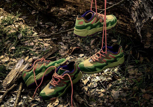 The great outdoors are invoked with a colorful mix of greens light and dark, as well as two shades of brown. Hits of pink, purple, and blue bring to mind the sneaker's '90s origins and all of the great activewear of the era. The lively shades of green look a lot like the work of Kosuke Sugimoto, a Tokyo-based artist who treats the outsides of sneakers with moss and turns them into planters.