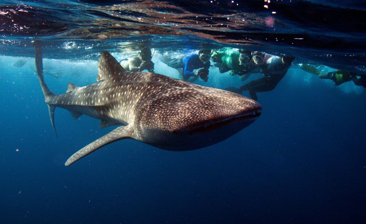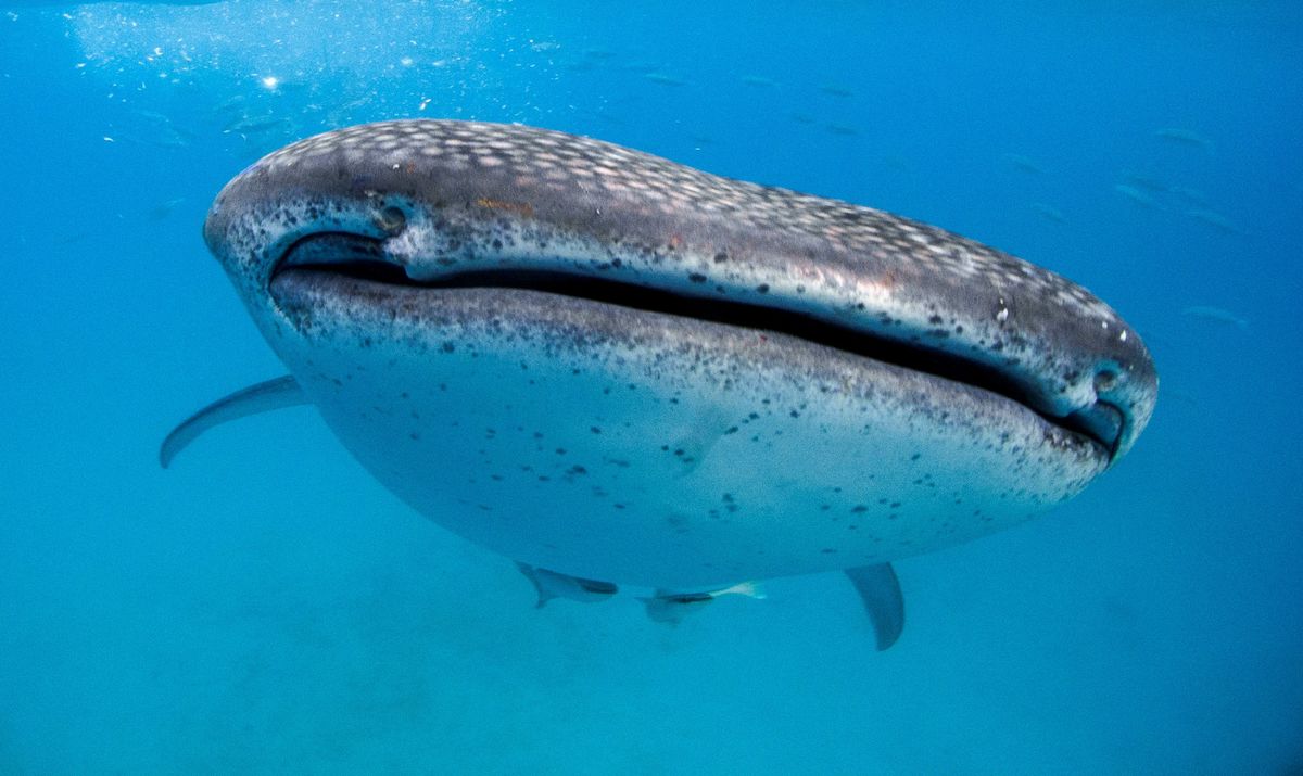 Whale sharks are filter feeders, swimming great distances through the world's tropical oceans to find enough plankton to sustain themselves. They have a brownish-grayish color on the back and sides with white spots, with a white underside.