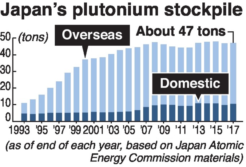 The commission also disclosed the amount of plutonium in Japan's possession as of the end of 2017. About 36.7 tons of Japanese plutonium was held in Britain and France, while about 10.5 tons was stored domestically for a total of about 47.3 tons. This is up 0.4 tons from the end of 2016 and is equivalent to about 6,000 times the amount of plutonium in the atomic bomb that was dropped on Nagasaki.