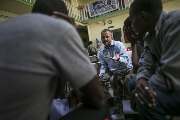 In the shelter's courtyard, one of the volunteer attorneys, Troy Elder, spoke in Creole to half a dozen Haitian men sitting in a circle around him.