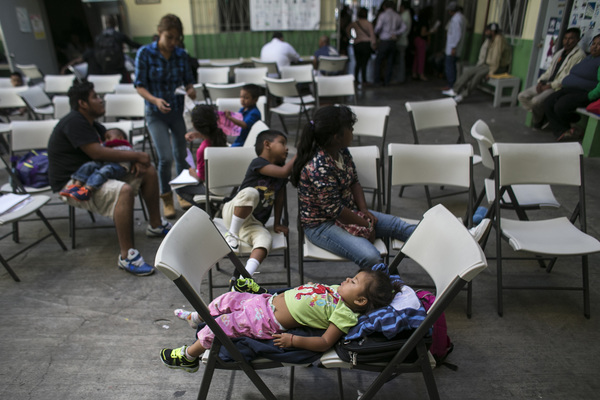 Outside, Alejandra, a 25-year-old from Veracruz, tried to corral her 6-year-old daughter and 5-year-old son in the shelter's courtyard as her boyfriend held their napping 1-year-old son.