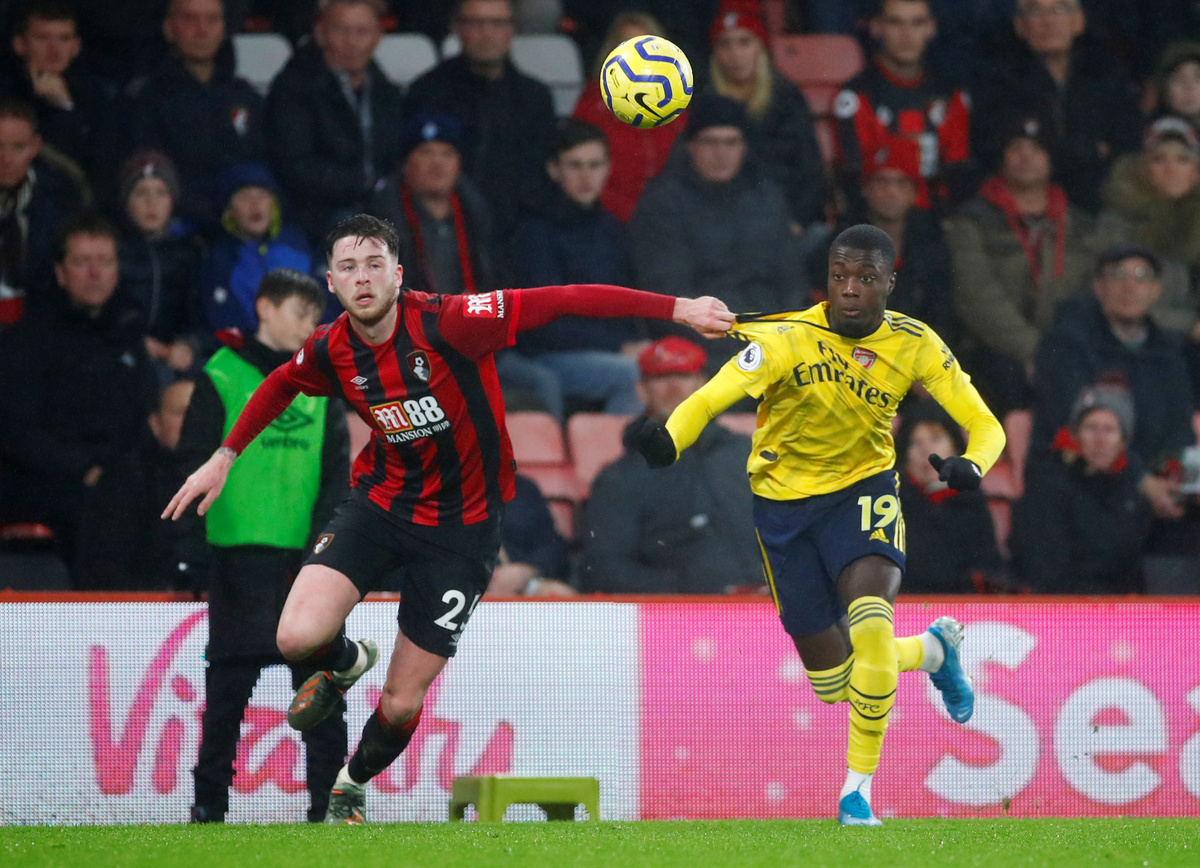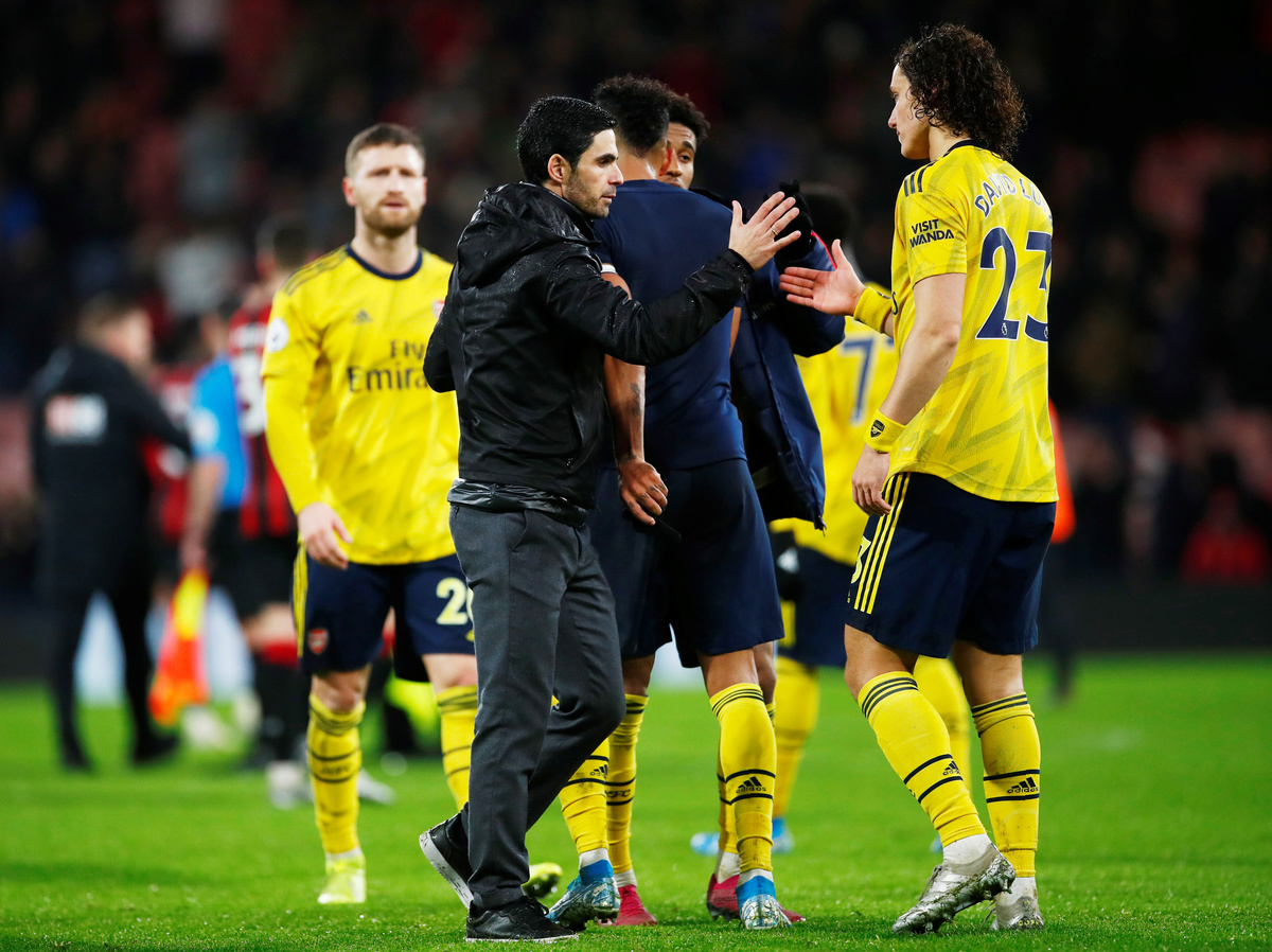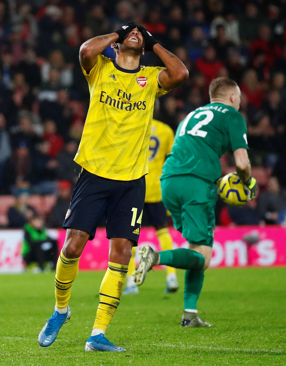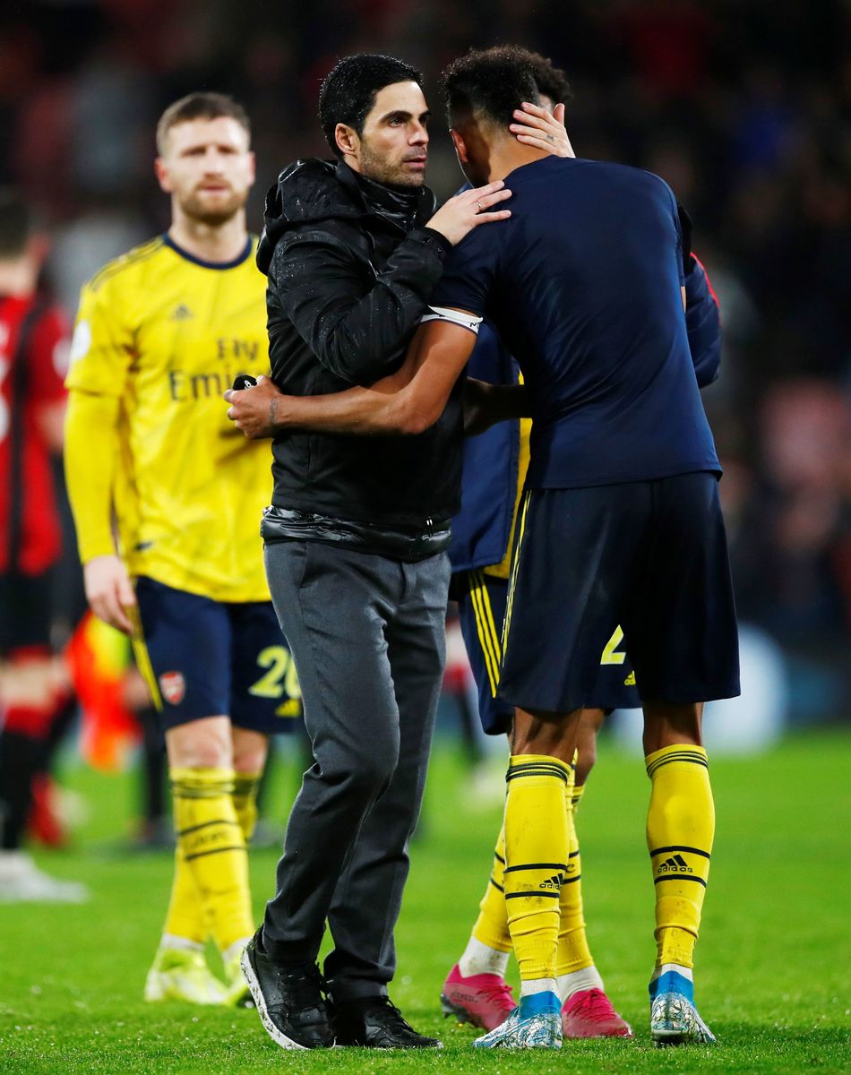 Soccer Football - Premier League - AFC Bournemouth v Arsenal - Vitality Stadium, Bournemouth, Britain - December 26, 2019 Arsenal's Pierre-Emerick Aubameyang reacts REUTERS/Eddie Keogh Soccer Football - Premier League - AFC Bournemouth v Arsenal - Vitality Stadium, Bournemouth, Britain - December 26, 2019 Arsenal manager Mikel Arteta shakes hands with David Luiz after the match REUTERS/Eddie Keogh Soccer Football - Premier League - AFC Bournemouth v Arsenal - Vitality Stadium, Bournemouth, Britain - December 26, 2019 Arsenal manager Mikel Arteta with Pierre-Emerick Aubameyang after the match REUTERS/Eddie Keogh Soccer Football - Premier League - AFC Bournemouth v Arsenal - Vitality Stadium, Bournemouth, Britain - December 26, 2019 Arsenal manager Mikel Arteta with Reiss Nelson after the match REUTERS/Eddie Keogh Soccer Football - Premier League - AFC Bournemouth v Arsenal - Vitality Stadium, Bournemouth, Britain - December 26, 2019 Arsenal manager Mikel Arteta reacts Action Images via Reuters/John Sibley Soccer Football - Premier League - AFC Bournemouth v Arsenal - Vitality Stadium, Bournemouth, Britain - December 26, 2019 Arsenal's Nicolas Pepe in action with Bournemouth's Jack Simpson REUTERS/Eddie Keogh Soccer Football - Premier League - AFC Bournemouth v Arsenal - Vitality Stadium, Bournemouth, Britain - December 26, 2019 Arsenal's Bukayo Saka in action with Bournemouth's Jack Stacey REUTERS/Eddie Keogh