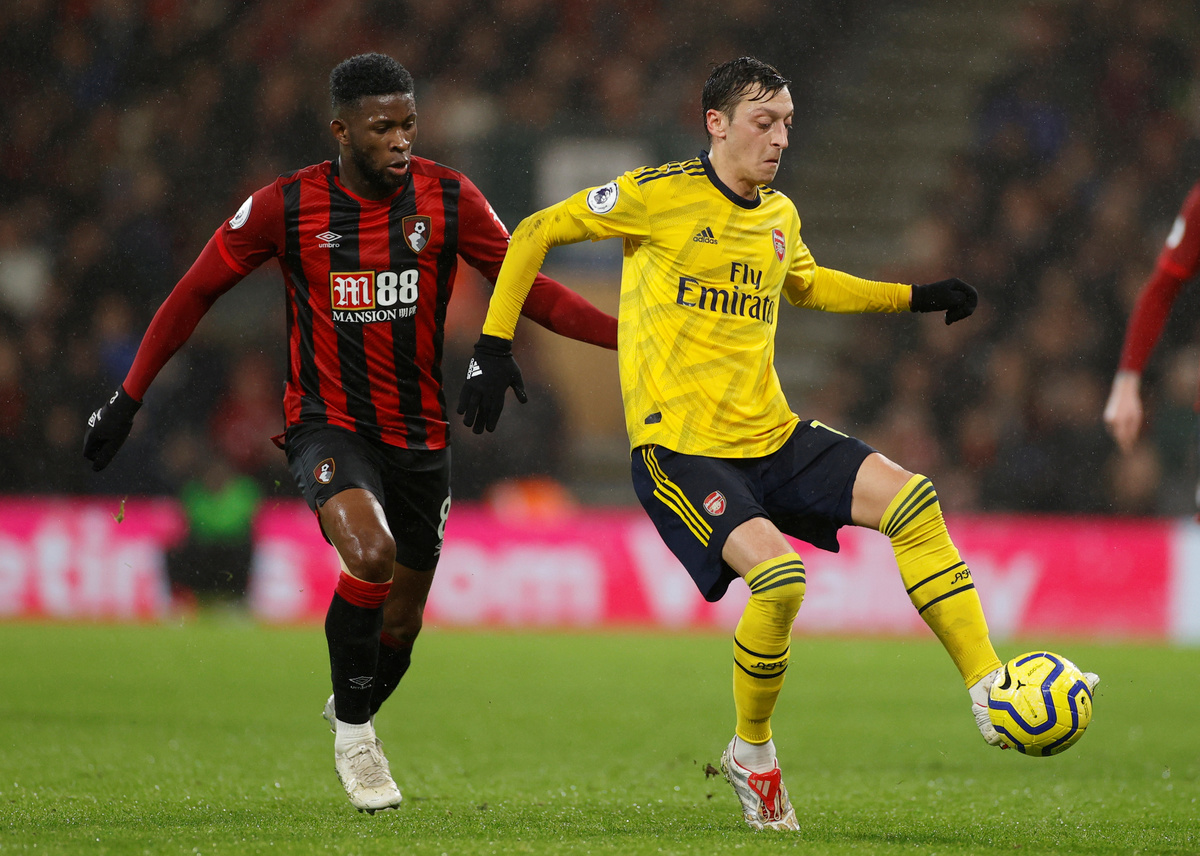 Soccer Football - Premier League - AFC Bournemouth v Arsenal - Vitality Stadium, Bournemouth, Britain - December 26, 2019 Arsenal's Mesut Ozil in action with Bournemouth's Jefferson Lerma Action Images via Reuters/John Sibley