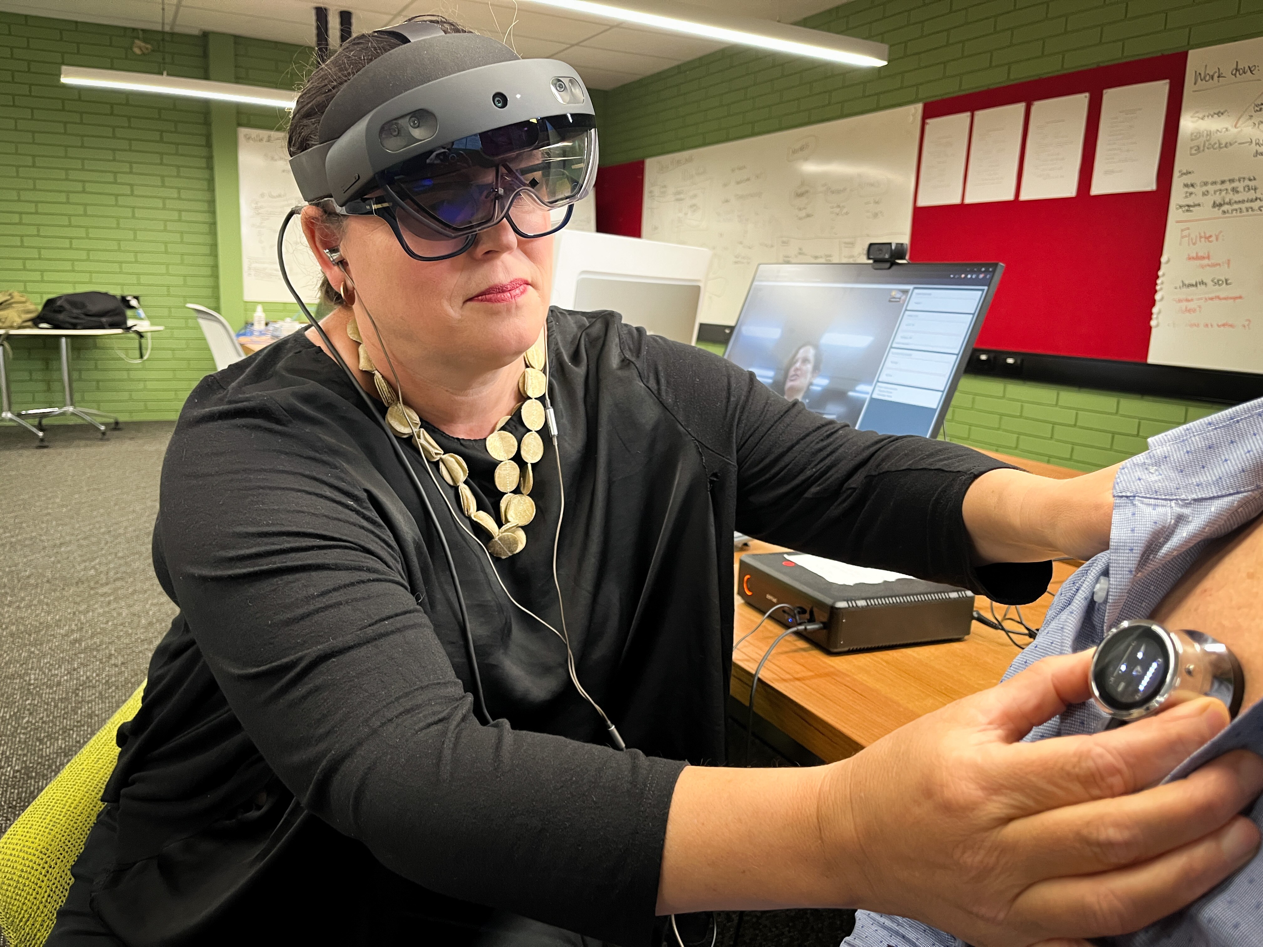 Emergency medicine doctor Jennie Hutton is wearing it as she places a wireless Bluetooth stethoscope on another stand-in patient.