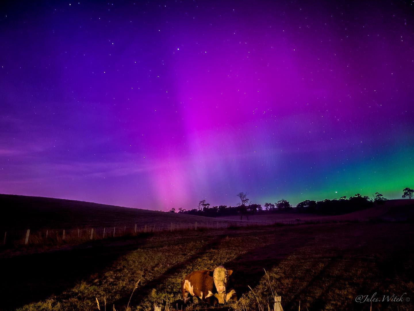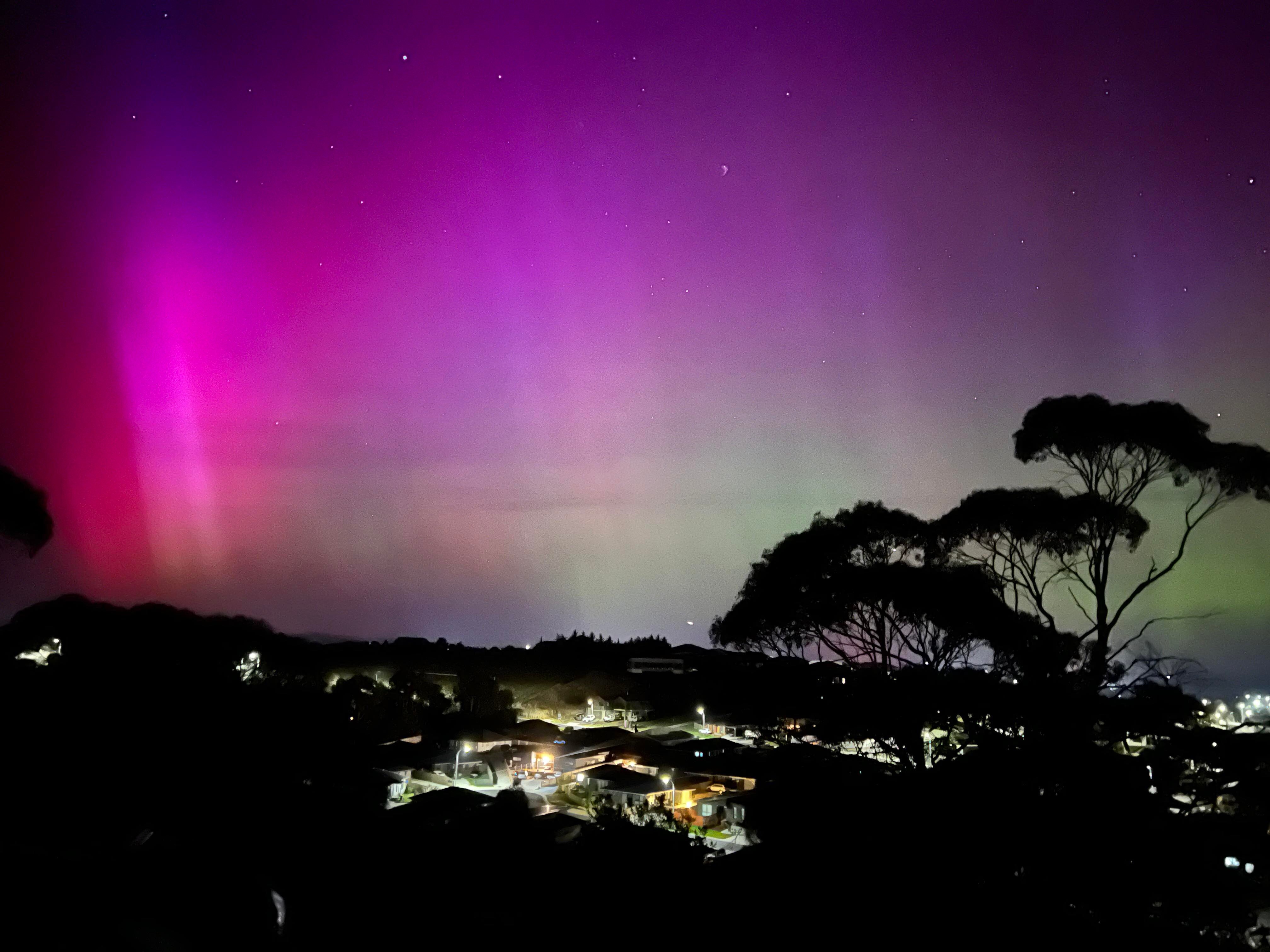 "This morning's display made me think I'm still asleep, dreaming. The colours were so vivid and bright — they were, in my son's words, 'Beautiful, magic sky colours,'" said Toby Schrapel, who saw the aurora from Judbury in Tasmania's Huon Valley.