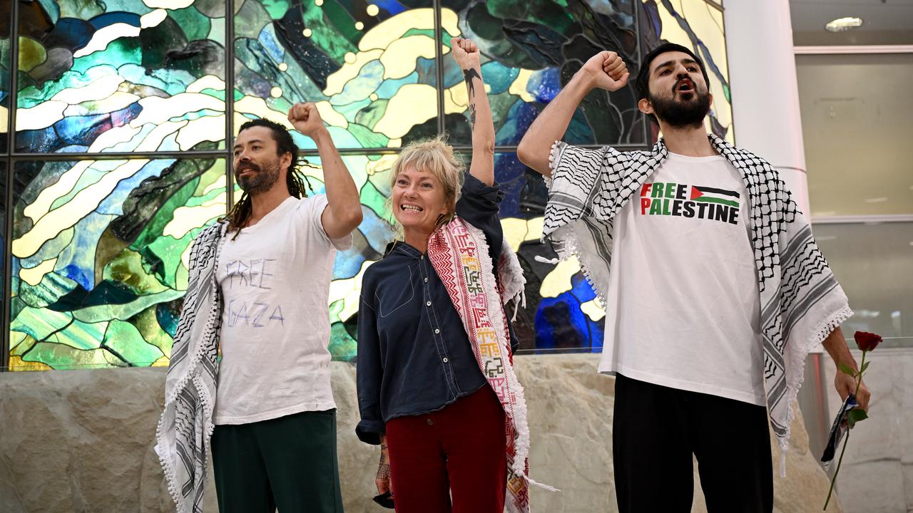 Juliet Lamont, Hamish Paterson and Abubakir Rafiq arrived in Sydney after more than a month at sea with the Global Sumud Flotilla.