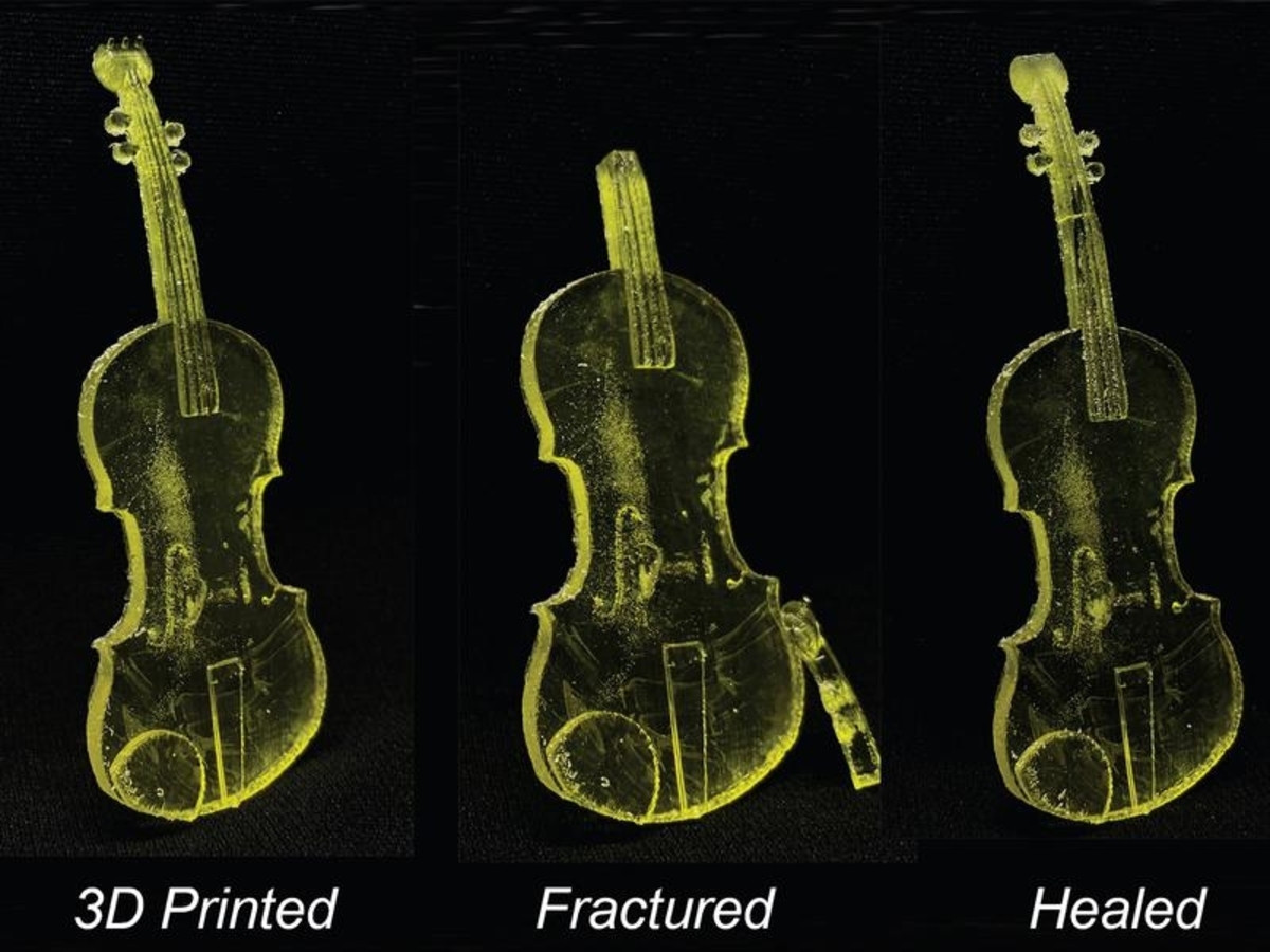 Experiments, including on a 3D printed violin, show the self-repaired plastic's strength is fully recovered to its original unbroken state.