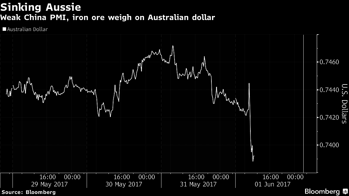 The Australian dollar earlier rose as much as 0.3 percent after retail sales data for April exceeded economists’ forecasts. The currency then reversed gains as China’s Caixin manufacturing gauge for May slid below 50 for the first time since June 2016.
