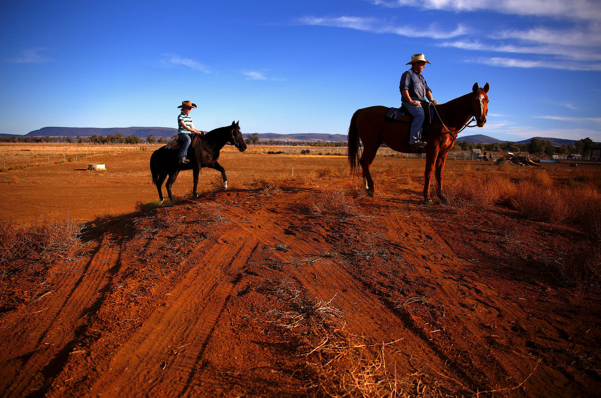 Farmer Scott Cooper and his daughter Charlie ride their horses along a fence in a drought-effected paddock on their property named "Nundah" located south of the central New South Wales town of Gunnedah in Australia, July 21, 2018. Picture taken July 21, 2018. REUTERS/David Gray