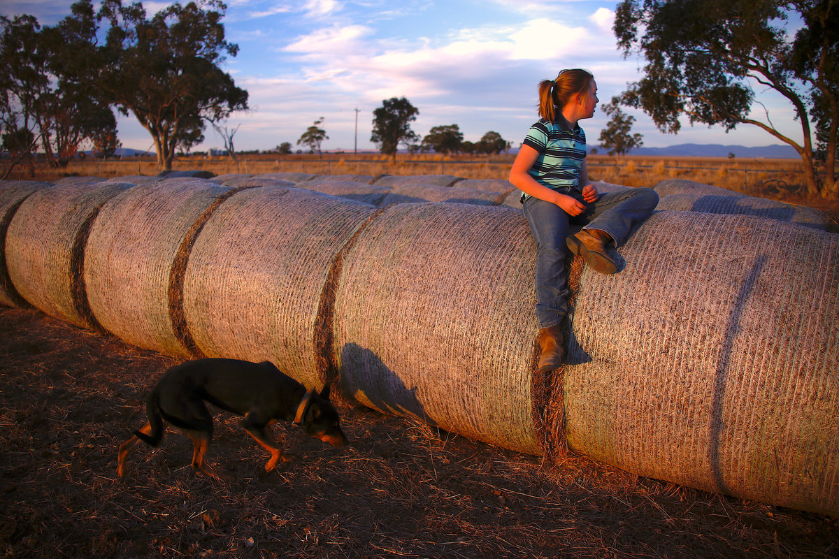 Charlie Cooper, daughter of farmer Scott Cooper, sits atop bales of hay sitting in a drought-affected paddock on their property named 'Nundah' located south of the central New South Wales town of Gunnedah in Australia, July 21, 2018. Picture taken July 21, 2018. REUTERS/David Gray