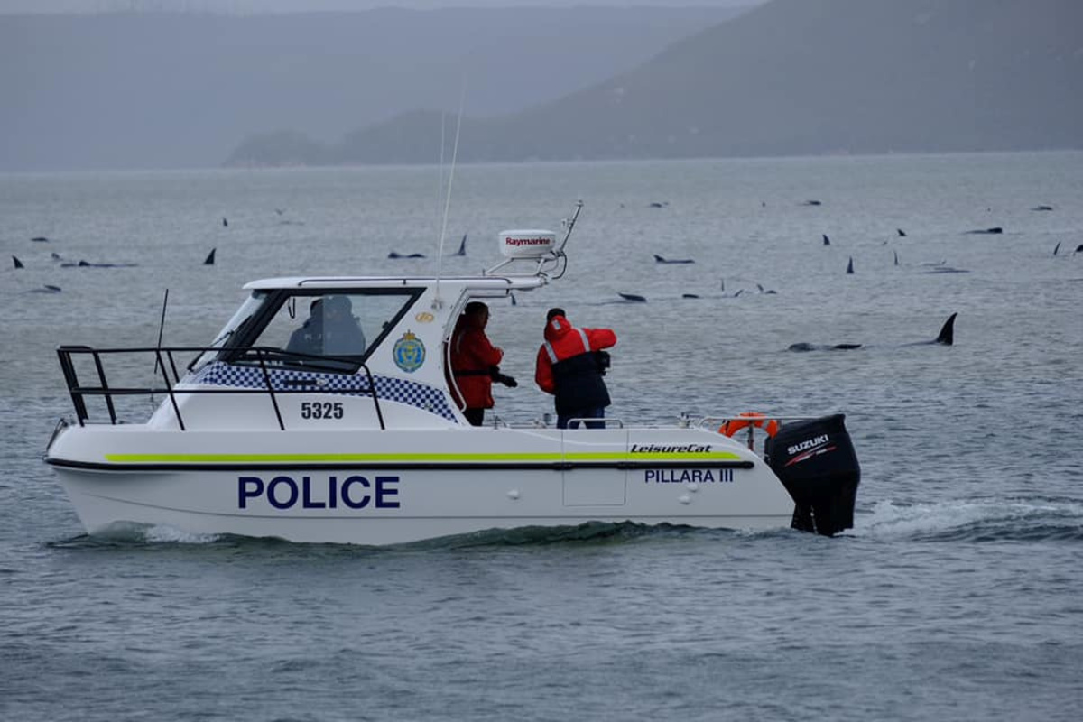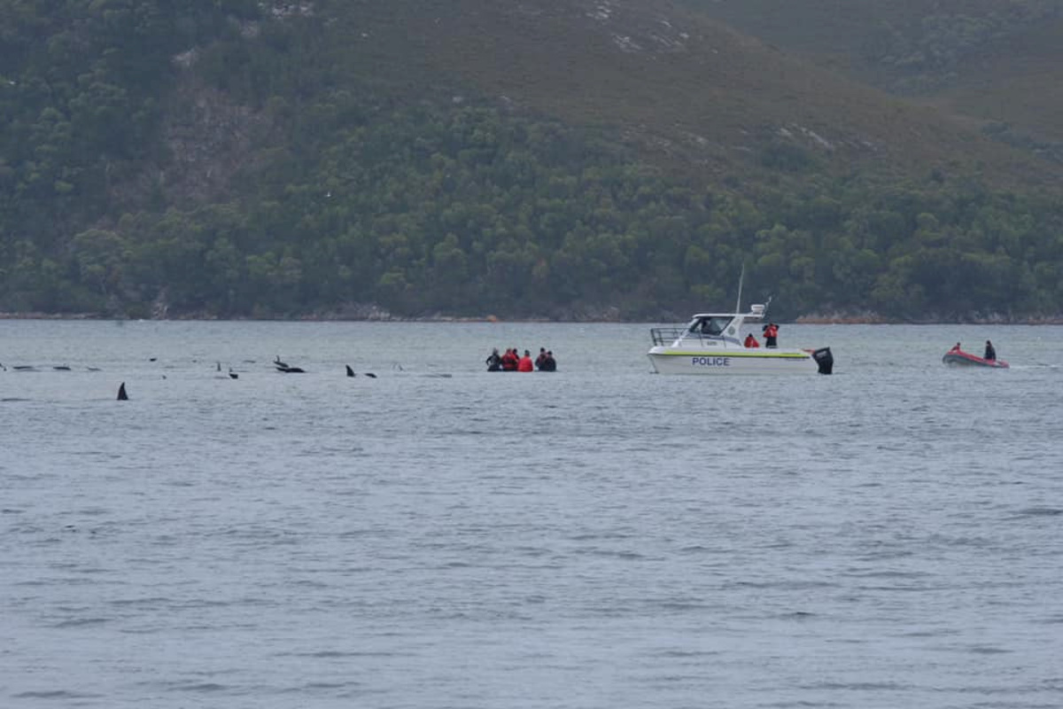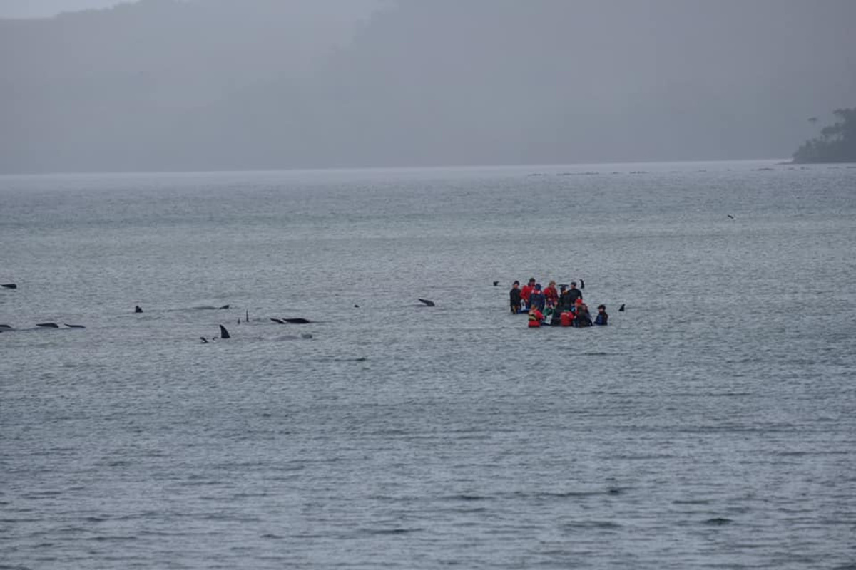 Footage showed large numbers of the animals prone on a wide sandbar at Macquarie Harbour, about 200 kms (120 miles) northwest of the state capital Hobart, while others floundered in slightly deeper water.