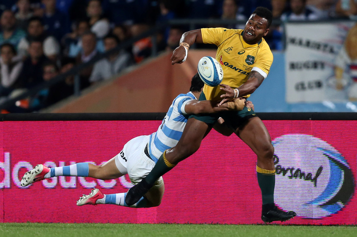 Rugby Union - Championship - Argentina Pumas v Australia Wallabies - Malvinas Argentinas stadium, Mendoza, Argentina - October 7, 2017 - Australia's Samu Kerevi passes the ball as he is tackled by Argentina's Matias Moroni. REUTERS/Marcos Brindicci