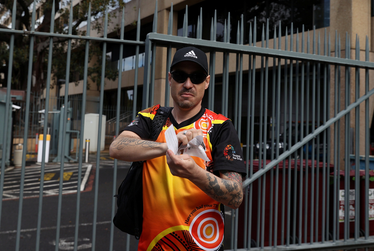 A demonstrator holds up a citation ticket issued by police, after police shut down a rally that was deemed unlawful, in Sydney, Australia, July 28, 2020. Demonstrators had planned the rally protesting the deaths of Indigenous Australians in police custody, in solidarity with Black Lives Matter (BLM) protests in the U.S. calling for an end to police brutality against African Americans. REUTERS/Loren Elliott