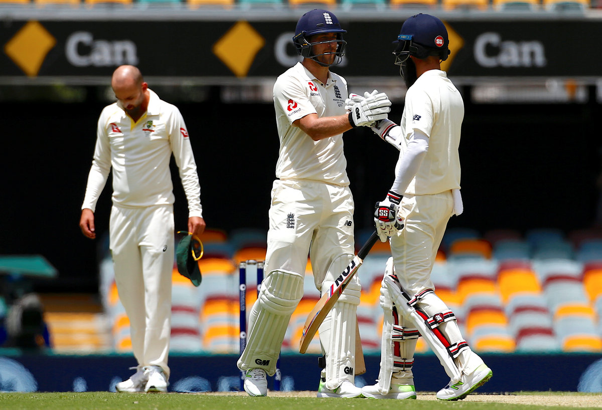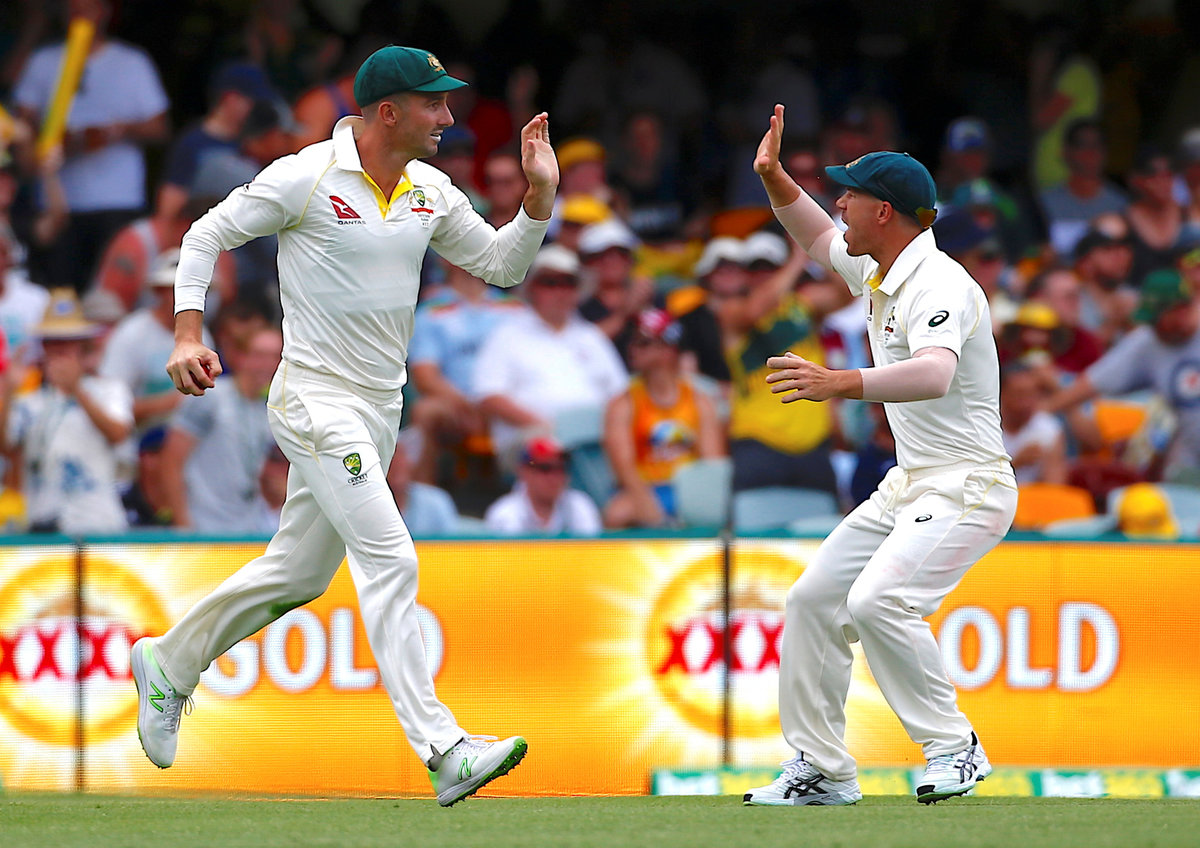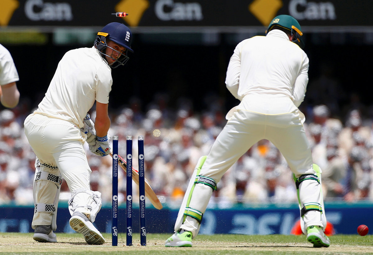 Cricket - Ashes test match - Australia v England - GABBA Ground, Brisbane, Australia, November 24, 2017. England's Chris Woakes looks at his stumps after being bowled by Australia's Nathan Lyon during the second day of the first Ashes cricket test match. REUTERS/David GrayCricket - Ashes test match - Australia v England - GABBA Ground, Brisbane, Australia, November 24, 2017. Australia's Mitchell Marsh celebrates with team mate David Warner after taking a catch to dismiss England's Dawid Malan during the second day of the first Ashes cricket test match. REUTERS/David GrayCricket - Ashes test match - Australia v England - GABBA Ground, Brisbane, Australia, November 24, 2017. England's Moeen Ali and Dawid Malan shake hands as Australia's Nathan Lyon walks behind them during the second day of the first Ashes cricket test match. REUTERS/David GrayCricket - Ashes test match - Australia v England - GABBA Ground, Brisbane, Australia, November 24, 2017. England's Dawid Malan avoids a bouncer bowled by Australia's Pat Cummins during the second day of the first Ashes cricket test match. REUTERS/David GrayCricket - Ashes test match - Australia v England - GABBA Ground, Brisbane, Australia, November 24, 2017. England's Moeen Ali prepares to hit a shot during the second day of the first Ashes cricket test match. REUTERS/David Gray