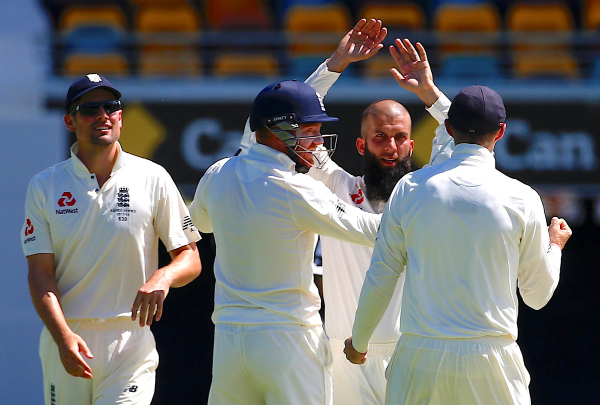 Cricket - Ashes test match - Australia v England - GABBA Ground, Brisbane, Australia, November 24, 2017. England's Moeen Ali celebrates with team mates after appealing succesfully for LBW to dismiss Australia's Usman Khawaja during the second day of the first Ashes cricket test match. REUTERS/David Gray