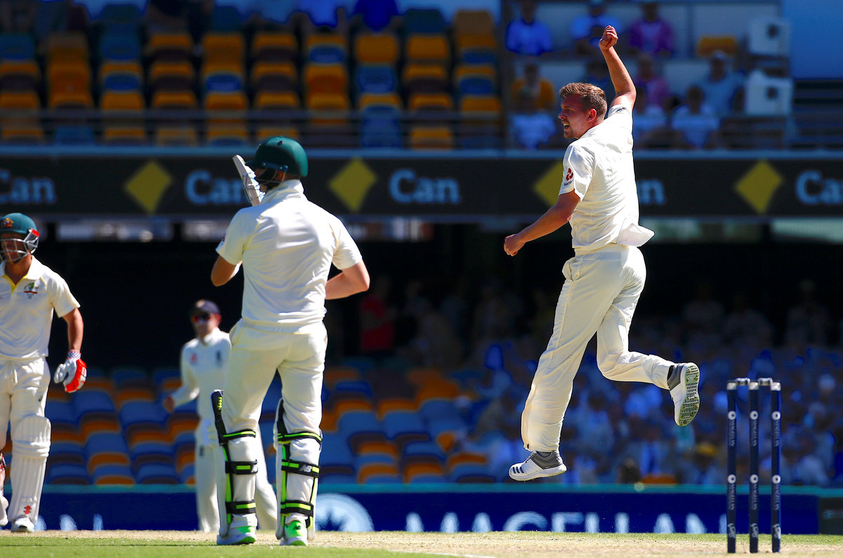 Cricket - Ashes test match - Australia v England - GABBA Ground, Brisbane, Australia, November 24, 2017. England's Jake Ball celebrates after dismissing Australia's David Warner during the second day of the first Ashes cricket test match. REUTERS/David Gray