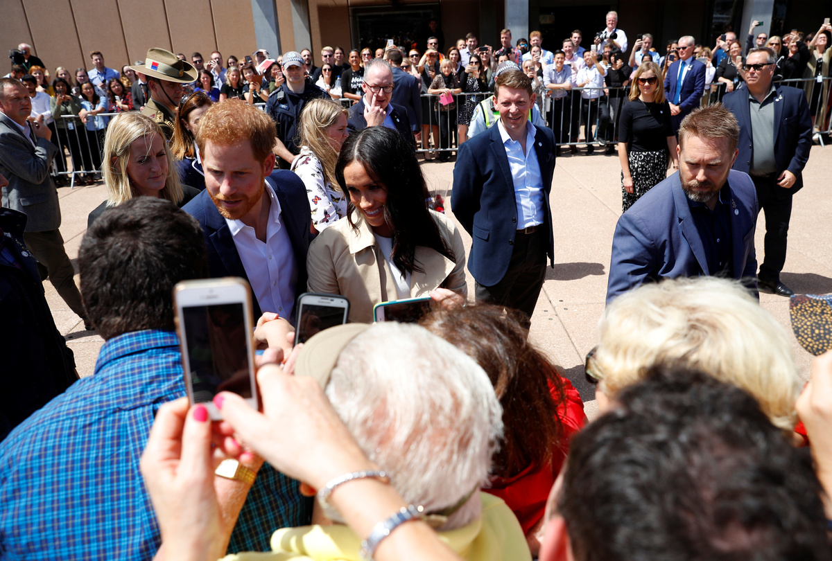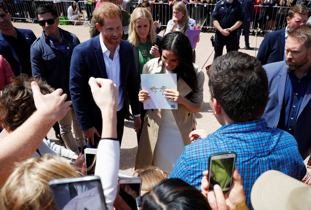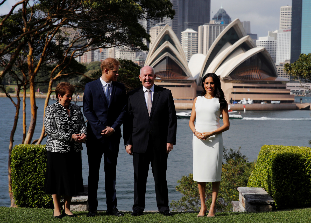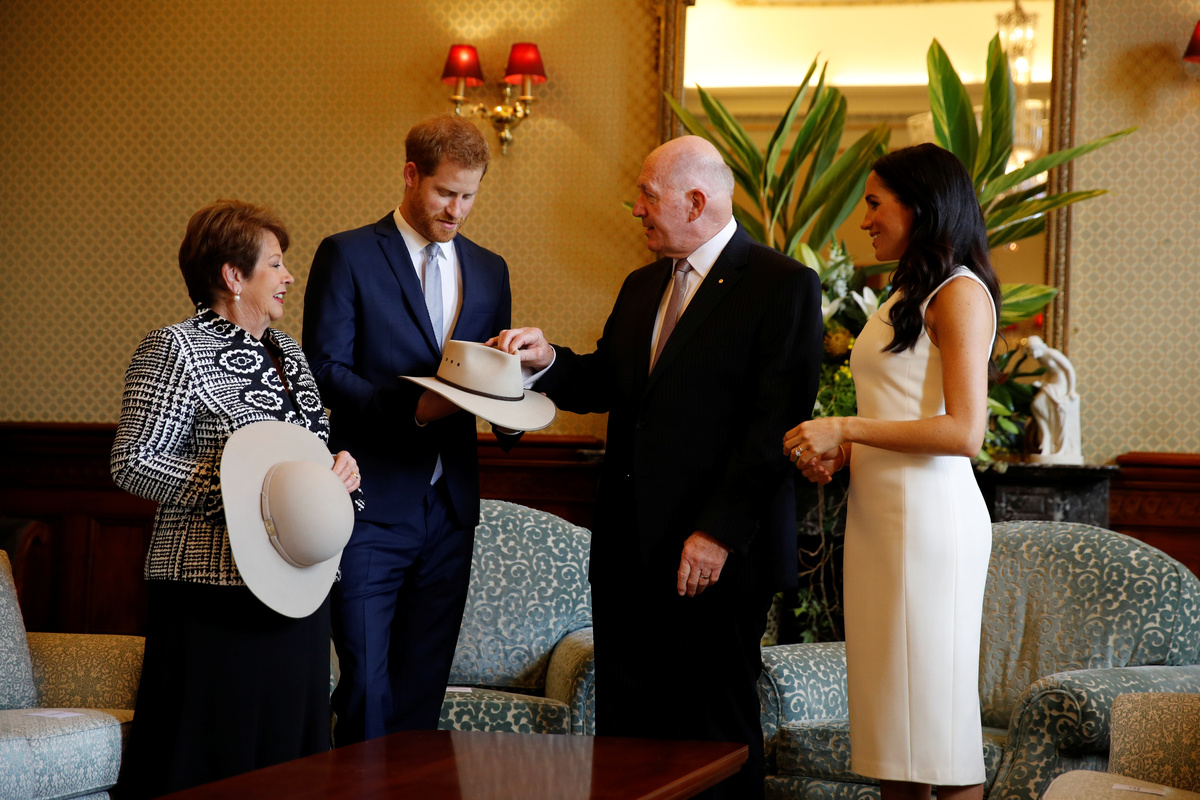 Britain's Prince Harry and wife Meghan, Duchess of Sussex speak to members of the public as they receive a card during a visit at the Sydney Opera House in Sydney, Australia October 16, 2018. REUTERS/Phil NobleBritain's Prince Harry and Meghan, Duchess of Sussex receive bouquets from Finley Blue and Dasha Gallagher at Taronga Zoo in Sydney, Australia, Tuesday, Oct. 16, 2018. Kirsty Wigglesworth/Pool via REUTERSBritain's Prince Harry and wife Meghan, Duchess of Sussex pose with Australia's Governor General Peter Cosgrove and wife Lynne Cosgrove at Admiralty House during their visit in Sydney, Australia October 16, 2018. REUTERS/Phil Noble/PoolBritain's Prince Harry and wife Meghan, Duchess of Sussex greet members of the public during a visit at the Sydney Opera House in Sydney, Australia October 16, 2018. REUTERS/Phil NobleBritain's Prince Harry and wife Meghan, Duchess of Sussex are welcomed by Australia's Governor General Peter Cosgrove and his wife Lynne Cosgrove at Admiralty House during their visit in Sydney, Australia October 16, 2018. REUTERS/Phil Noble/PoolCrowds wait for the arrival of Britain's Prince Harry and Meghan, Duchess of Sussex, at the Sydney Opera House in central Sydney, Australia, October 16, 2018. REUTERS/Steven SaphoreBritain's Prince Harry and wife Meghan, Duchess of Sussex pose with Australia's Governor General Peter Cosgrove and his wife Lynne Cosgrove at Admiralty House during their visit in Sydney, Australia October 16, 2018. REUTERS/Phil Noble/PoolBritain's Prince Harry and wife Meghan, Duchess of Sussex walk with Australia's Governor General Peter Cosgrove and his wife Lynne Cosgrove at Admiralty House during their visit in Sydney, Australia October 16, 2018. REUTERS/Phil Noble/PoolBritain's Prince Harry and wife Meghan, Duchess of Sussex look at bush hats with Australia's Governor General Peter Cosgrove and his wife Lynne Cosgrove at Admiralty House during their visit in Sydney, Australia October 16, 2018. REUTERS/Phil Noble/PoolBritain's Prince Harry and Australia's Governor General Peter Cosgrove at Admiralty House in Sydney, Australia October 16, 2018. REUTERS/Phil Noble/PoolBritain's Prince Harry and wife Meghan, Duchess of Sussex look at bush hats with Australia's Governor General Peter Cosgrove at Admiralty House during their visit in Sydney, Australia October 16, 2018. REUTERS/Phil Noble/PoolBritain's Meghan, Duchess of Sussex arrives at Admiralty House in Sydney, Australia October 16, 2018. REUTERS/Phil Noble/Pool