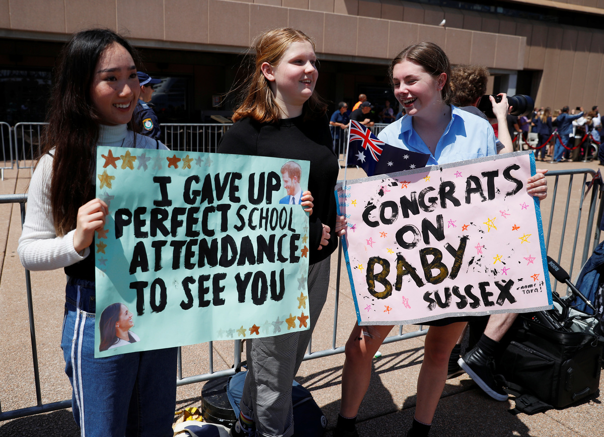 SYDNEY (Reuters) - Crowds thronged the Sydney Opera House and the shores of the city's sparkling harbor on Tuesday to catch a glimpse of Prince Harry and his wife, Meghan, on their first public appearance in Australia since the announcement they were expecting a child.