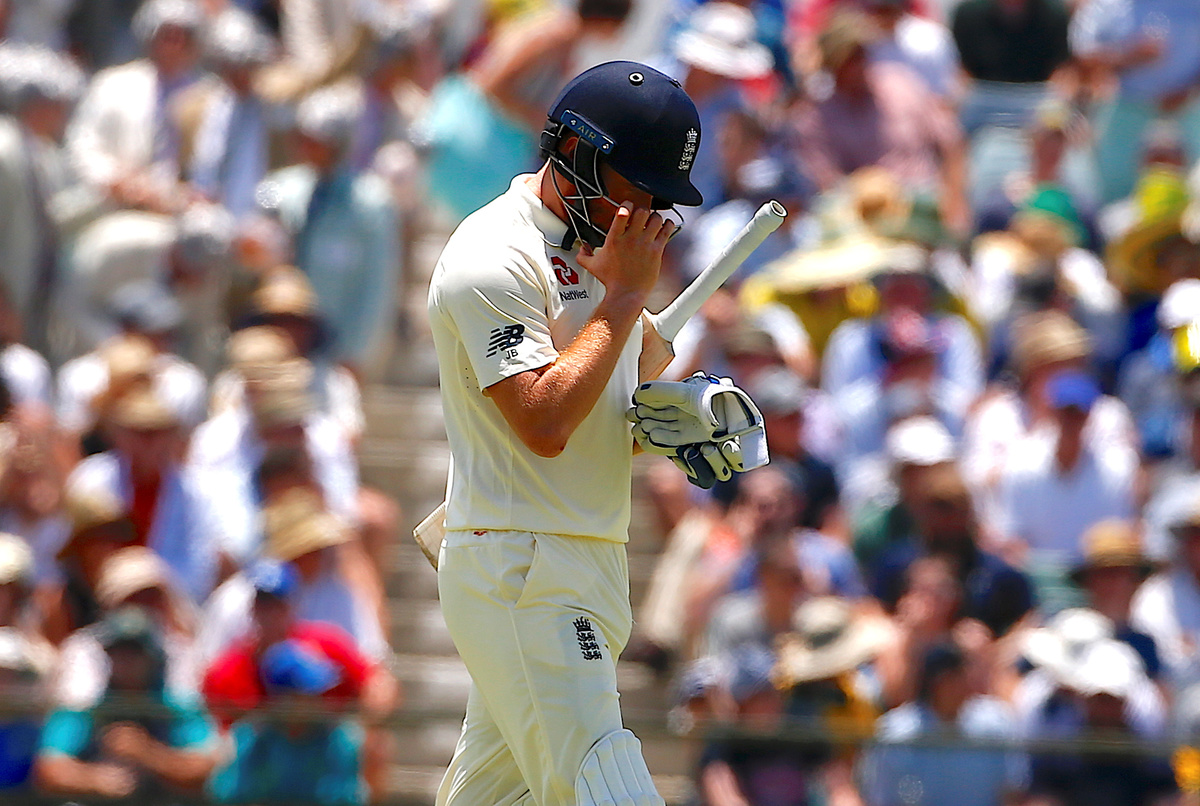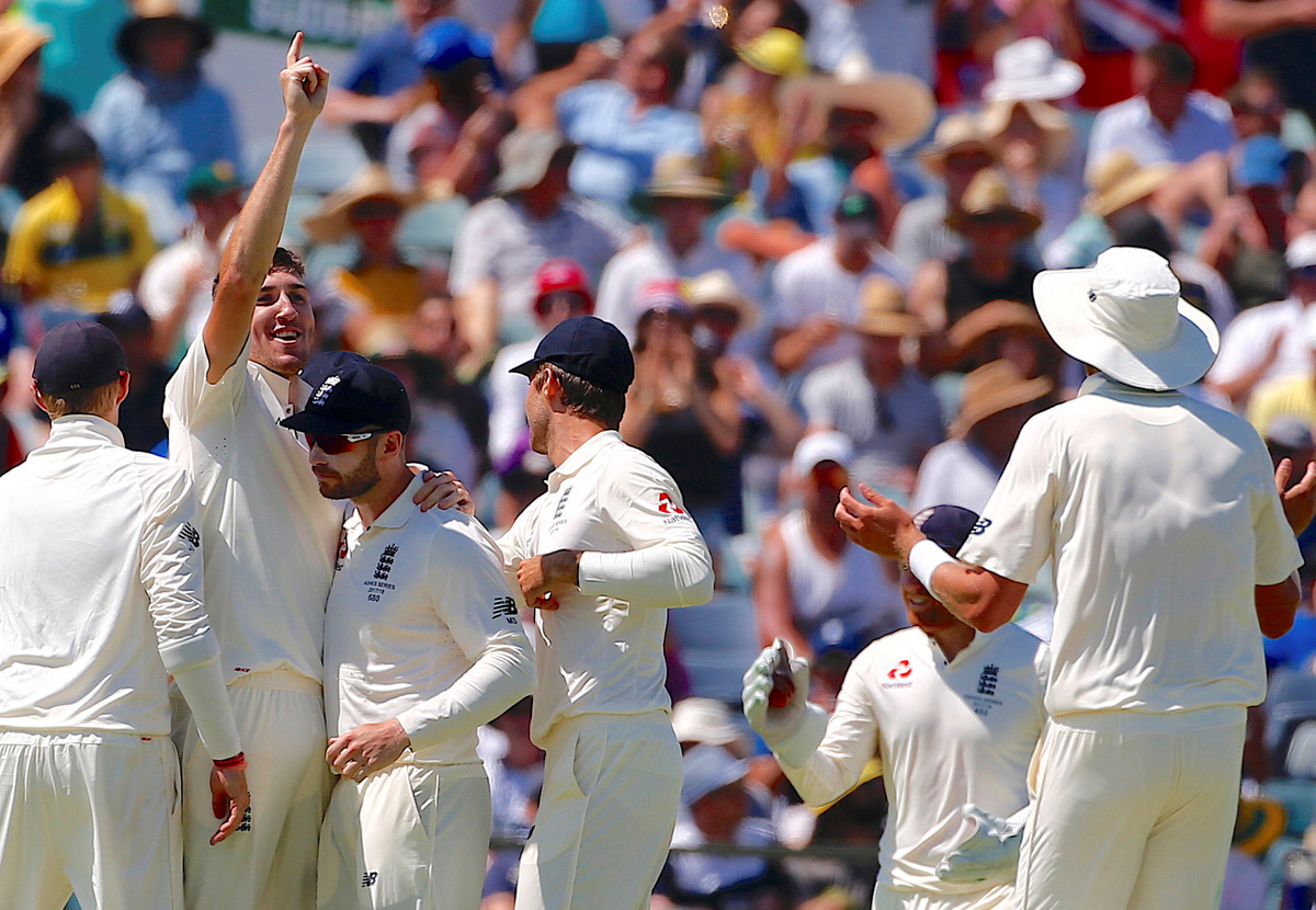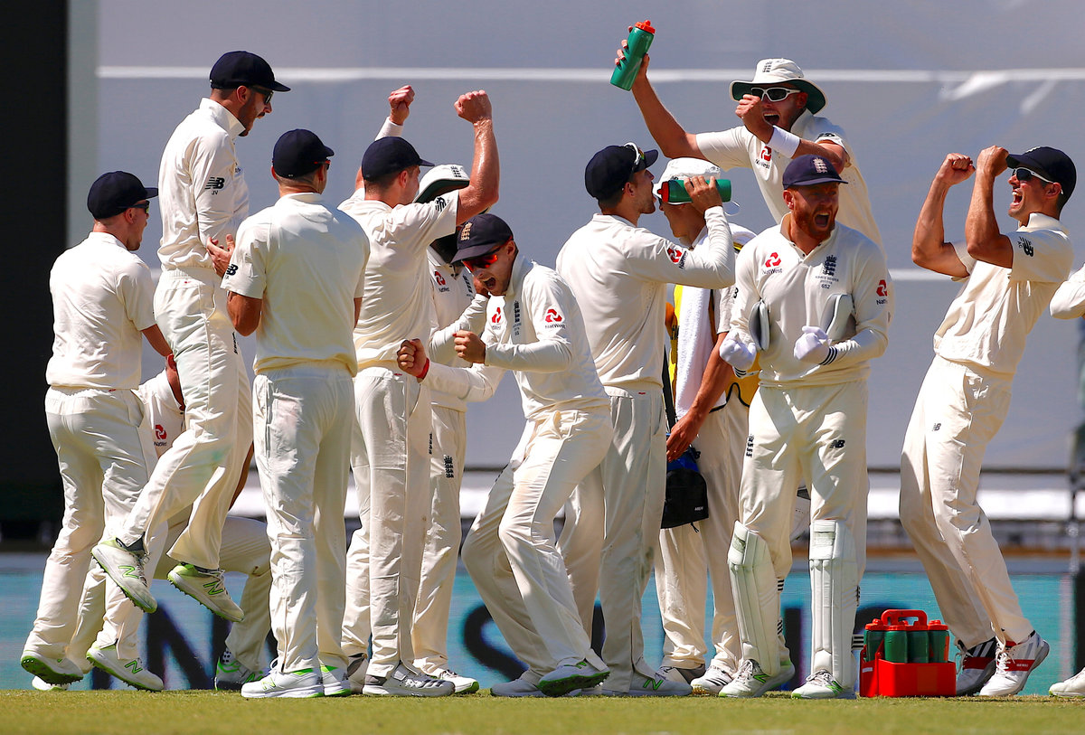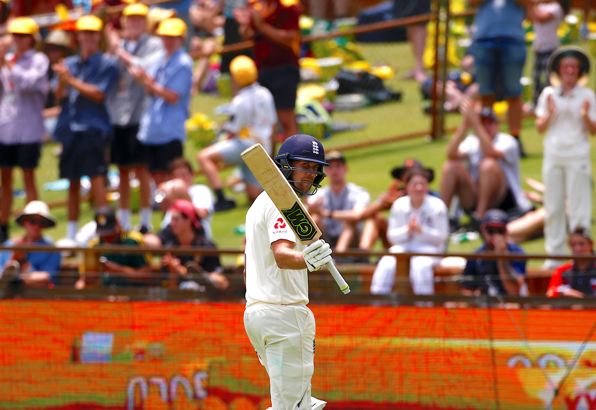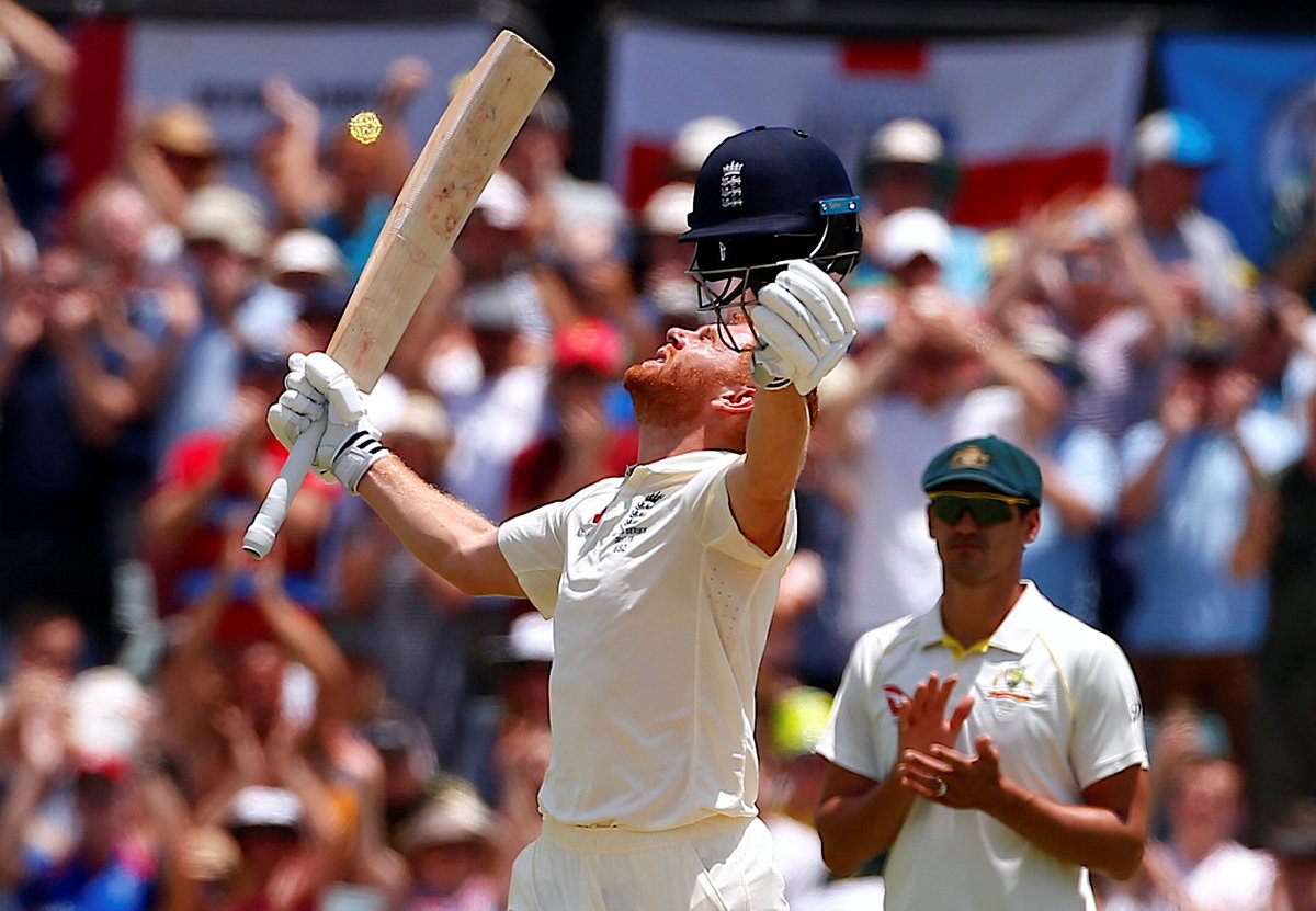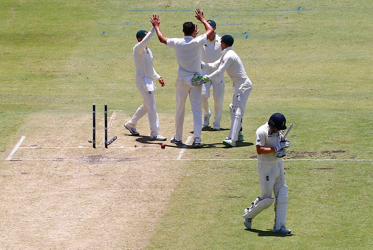 Cricket - Ashes test match - Australia v England - WACA Ground, Perth, Australia, December 15, 2017. England's Jonny Bairstow watches as Australia's Mitchell Starc appeals unsuccessfully for LBW for England's Dawid Malan during the second day of the third Ashes cricket test match. REUTERS/David GrayCricket - Ashes test match - Australia v England - WACA Ground, Perth, Australia, December 14, 2017. England's Dawid Malan hits a shot to reach his century during the first day of the third Ashes cricket test match. REUTERS/David GrayCricket - Ashes test match - Australia v England - WACA Ground, Perth, Australia, December 14, 2017. England's Dawid Malan celebrates after reaching his century during the first day of the third Ashes cricket test match. REUTERS/David GrayCricket - Ashes test match - Australia v England - WACA Ground, Perth, Australia, December 14, 2017. England's Dawid Malan celebrates with team mate Jonny Bairstow after reaching his century during the first day of the third Ashes cricket test match. REUTERS/David GrayCricket - Ashes test match - Australia v England - WACA Ground, Perth, Australia, December 15, 2017. English supporters known as the 'Barmy Army' cheer after Australia's captain Steve Smith called for a review after an appeal for LBW on England's Dawid Malan was unsuccessful during the second day of the third Ashes cricket test match. REUTERS/David GrayCricket - Ashes test match - Australia v England - WACA Ground, Perth, Australia, December 15, 2017. Australia's Mitchell Starc applauds as England's Jonny Bairstow celebrates reaching his century during the second day of the third Ashes cricket test match. REUTERS/David GrayCricket - Ashes test match - Australia v England - WACA Ground, Perth, Australia, December 15, 2017. England's Dawid Malan reacts as he walks off the ground after being dismissed during the second day of the third Ashes cricket test match. REUTERS/David GrayCricket - Ashes test match - Australia v England - WACA Ground, Perth, Australia, December 15, 2017. England's Moeen Ali watches as Australia's captain Steve Smith takes a catch to dismiss him during the second day of the third Ashes cricket test match. REUTERS/David GrayCricket - Ashes test match - Australia v England - WACA Ground, Perth, Australia, December 15, 2017. Australia's Pat Cummins reacts after taking a catch to dismiss England's Chris Woakes during the second day of the third Ashes cricket test match. REUTERS/David GrayCricket - Ashes test match - Australia v England - WACA Ground, Perth, Australia, December 15, 2017. England's Jonny Bairstow reacts as he walks off the ground after being bowled by Australia's Mitchell Starc during the second day of the third Ashes cricket test match. REUTERS/David GrayCricket - Ashes test match - Australia v England - WACA Ground, Perth, Australia, December 15, 2017. England's Jonny Bairstow reacts as teammate Stuart Broad pats him on the back as he walks off the ground after being bowled by Australia's Mitchell Starc during the second day of the third Ashes cricket test match. REUTERS/David Gray