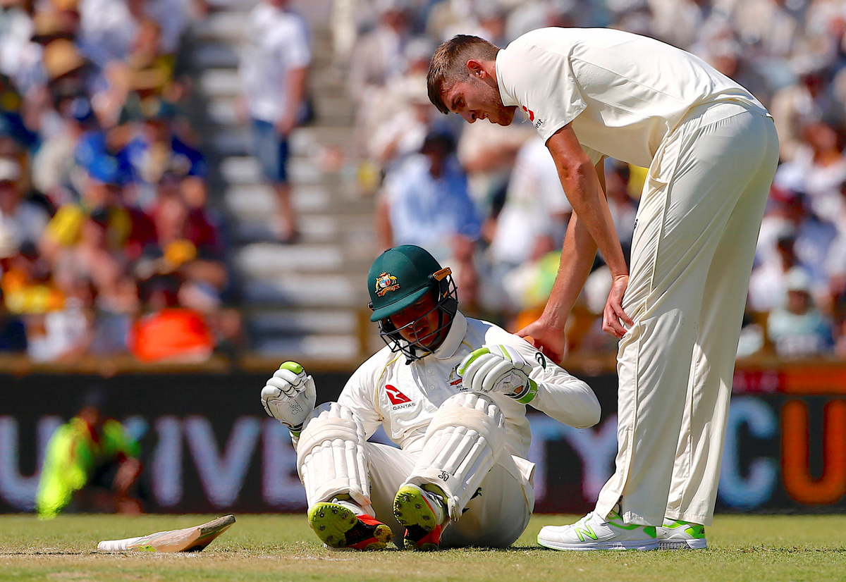 Cricket - Ashes test match - Australia v England - WACA Ground, Perth, Australia, December 15, 2017. England's Craig Overton assists Australia's Usman Khawaja after he fell over during the second day of the third Ashes cricket test match. REUTERS/David Gray