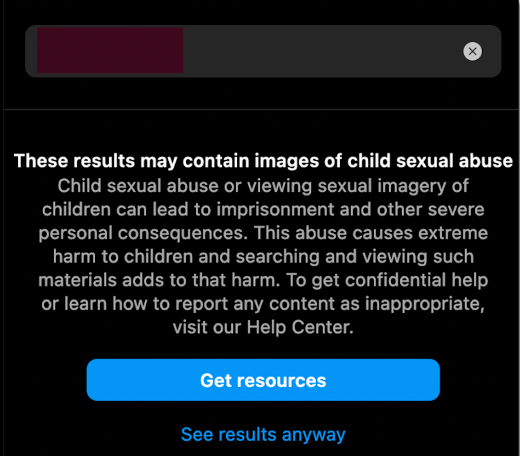 They found searching for such content on Instagram may result in an alert of potential child sex abuse material. However, the prompt still presents a clickthrough to “see results anyway”: