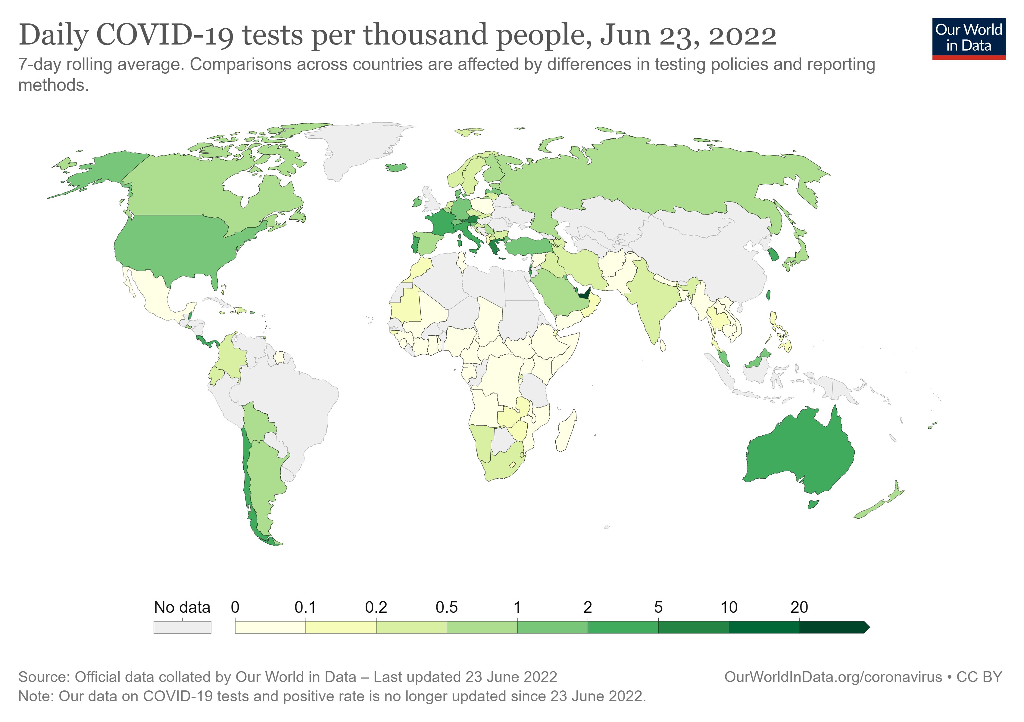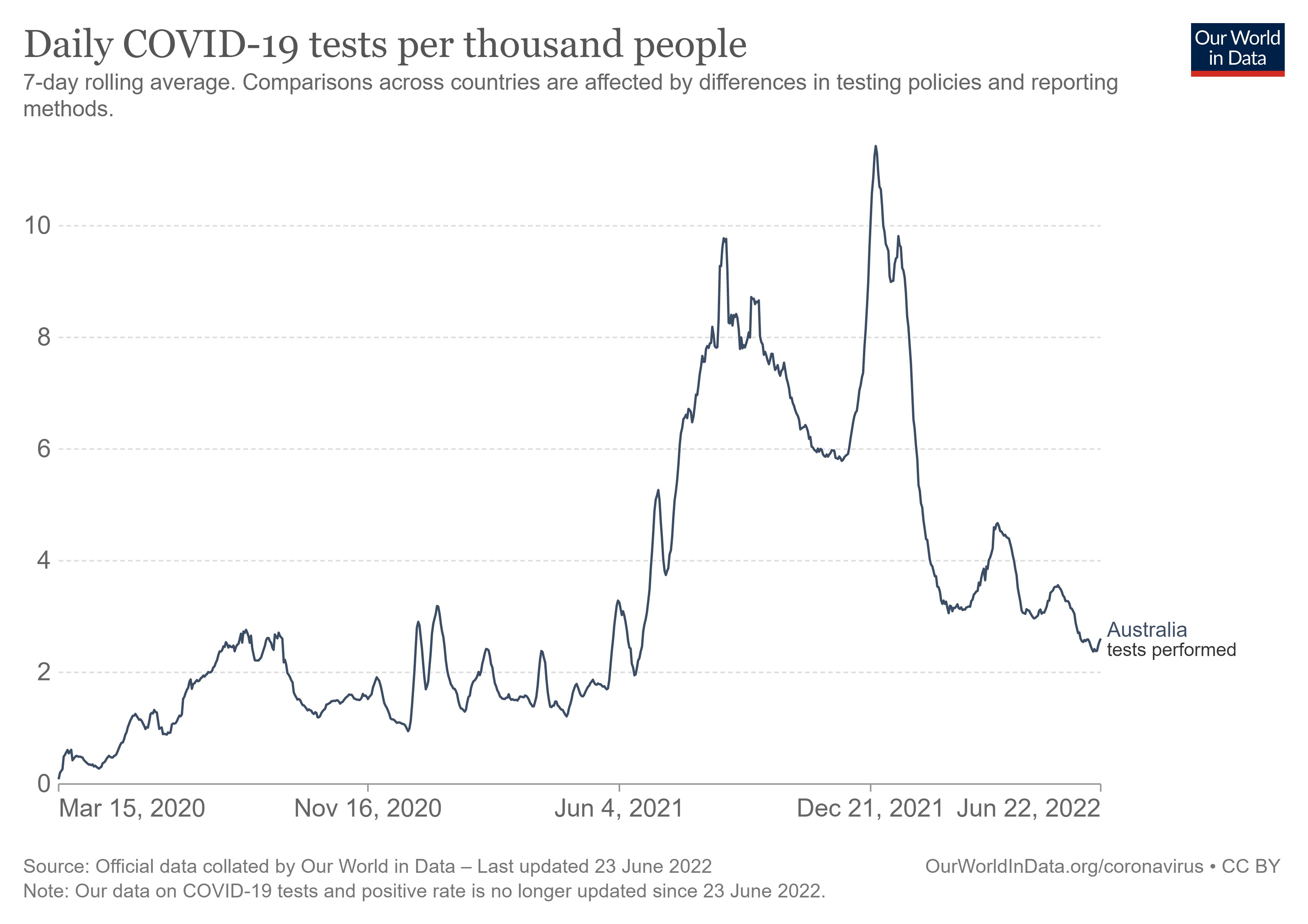 From March 2020 to June 2022, 2.6 tests per thousand were performed in Australia, according to Our World in Data.