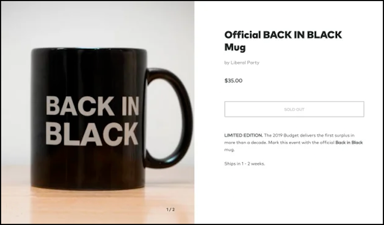 That 2019 budget forecast increasing surpluses as far as the eye could see (which was ten years, the limit of the graphs presented in the budget papers). The Liberal Party began selling “back in the black” celebratory mugs at A$35 each.